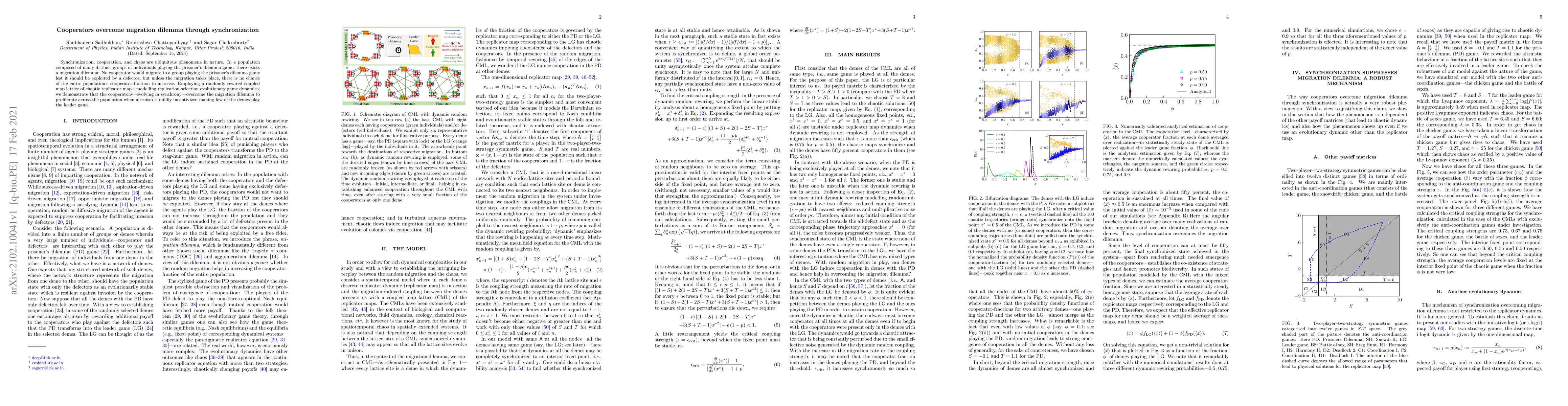 Synchronization, cooperation, and chaos are ubiquitous phenomena in nature. In a population composed of many distinct groups of individuals playing the prisoner's dilemma game, there exists a migration dilemma: No cooperator would migrate to a group playing the prisoner's dilemma game lest it should be exploited by a defector; but unless the migration takes place, there is no chance of the entire population's cooperator-fraction to increase. Employing a randomly rewired coupled map lattice of chaotic replicator maps, modelling replication-selection evolutionary game dynamics, we demonstrate that the cooperators -- evolving in synchrony -- overcome the migration dilemma to proliferate across the population when altruism is mildly incentivized making few of the demes play the leader game.