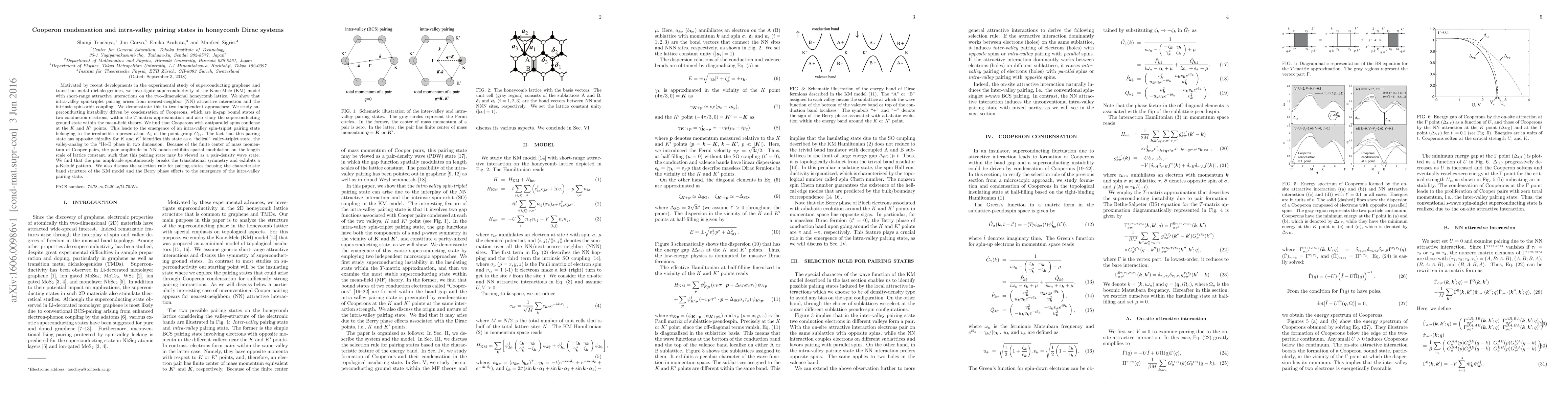 Motivated by recent developments in the experimental study of superconducting graphene and transition metal dichalcogenides, we investigate superconductivity of the Kane-Mele (KM) model with short-range attractive interactions on the two-dimensional honeycomb lattice. We show that intra-valley spin-triplet pairing arises from nearest-neighbor (NN) attractive interaction and the intrinsic spin-orbit coupling. We demonstrate this in two independent approaches: We study superconducting instability driven by condensation of Cooperons, which are in-gap bound states of two conduction electrons, within the $T$-matrix approximation and also study the superconducting ground state within the mean-field theory. We find that Cooperons with antiparallel spins condense at the $K$ and $K'$ points. This leads to the emergence of an intra-valley spin-triplet pairing state belonging to the irreducible representation A$_1$ of the point group $C_{6v}$. The fact that this pairing state has opposite chirality for $K$ and $K'$ identifies this state as a "helical" valley-triplet state, the valley-analog to the $^3$He-B phase in two dimension. Because of the finite center of mass momentum of Cooper pairs, the pair amplitude in NN bonds exhibits spatial modulation on the length scale of lattice constant, such that this pairing state may be viewed as a pair-density wave state. We find that the pair amplitude spontaneously breaks the translational symmetry and exhibits a $p$-Kekul\'e pattern. We also discuss the selection rule for pairing states focusing the characteristic band structure of the KM model and the Berry phase effects to the emergence of the intra-valley pairing state.