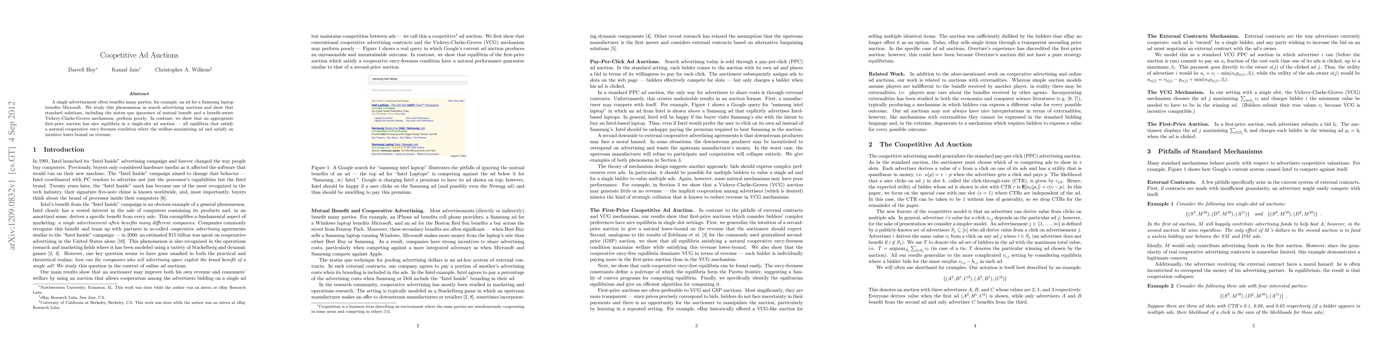A single advertisement often benefits many parties, for example, an ad for a Samsung laptop benefits Microsoft. We study this phenomenon in search advertising auctions and show that standard solutions, including the status quo ignorance of mutual benefit and a benefit-aware Vickrey-Clarke-Groves mechanism, perform poorly. In contrast, we show that an appropriate first-price auction has nice equilibria in a single-slot ad auction --- all equilibria that satisfy a natural cooperative envy-freeness condition select the welfare-maximizing ad and satisfy an intuitive lower-bound on revenue.