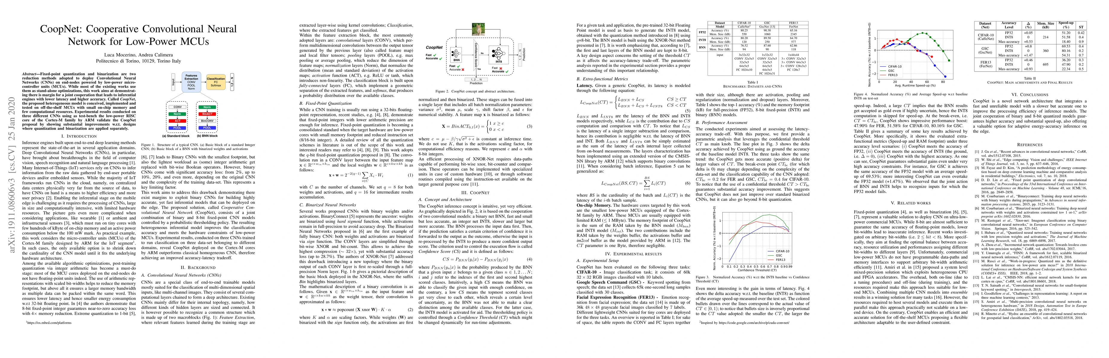 CoopNet proposes a cooperative approach combining fixed-point quantization and binarization to deploy Convolutional Neural Networks on low-power MCUs, achieving lower latency and higher accuracy compared to separate optimizations. Experimental results on Cortex-M family MCUs show significant improvements over traditional methods.