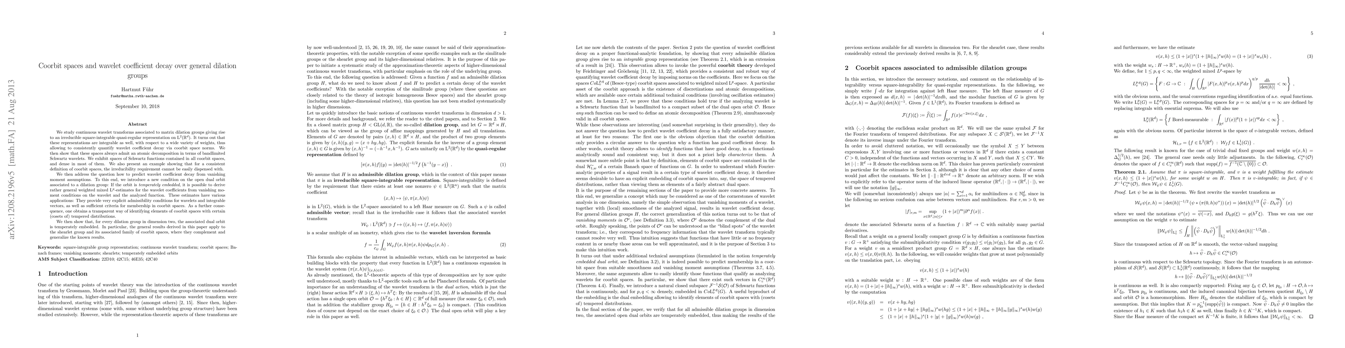 We study continuous wavelet transforms associated to matrix dilation groups giving rise to an irreducible square-integrable quasi-regular representation on ${\rm L}^2(\mathbb{R}^d)$. We first prove that these representations are integrable as well, with respect to a wide variety of weights, thus allowing to consistently quantify coefficient decay via coorbit space norms. We then show that these spaces always admit an atomic decomposition in terms of bandlimited Schwartz wavelets. We exhibit spaces of Schwartz functions densely contained in (most of) the coorbit spaces. We also present an example showing that for a consistent definition of coorbit spaces, the irreducibility requirement cannot be easily dispensed with. We then address the question how to predict wavelet coefficient decay from vanishing moment assumptions. To this end, we introduce a new condition on the open dual orbit associated to a dilation group: If the orbit is temperately embedded, it is possible to derive rather general weighted ${\rm L}^{p,q}$-estimates for the wavelet coefficients from vanishing moment conditions on the wavelet and the analyzed function. These estimates have various applications: They provide very explicit admissibility conditions for wavelets and integrable vectors, as well as sufficient criteria for membership in coorbit spaces. As a further consequence, one obtains a transparent way of identifying elements of coorbit spaces with certain (cosets of) tempered distributions. We then show that, for every dilation group in dimension two, the associated dual orbit is temperately embedded. In particular, the general results derived in this paper apply to the shearlet group and its associated family of coorbit spaces, where they complement and generalize the known results.