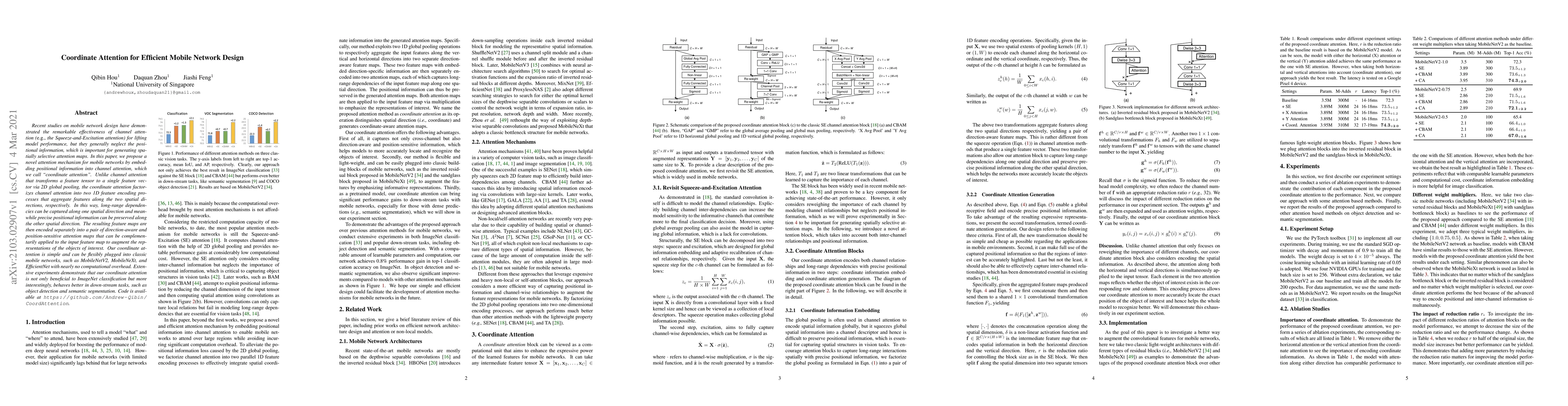 Recent studies on mobile network design have demonstrated the remarkable effectiveness of channel attention (e.g., the Squeeze-and-Excitation attention) for lifting model performance, but they generally neglect the positional information, which is important for generating spatially selective attention maps. In this paper, we propose a novel attention mechanism for mobile networks by embedding positional information into channel attention, which we call "coordinate attention". Unlike channel attention that transforms a feature tensor to a single feature vector via 2D global pooling, the coordinate attention factorizes channel attention into two 1D feature encoding processes that aggregate features along the two spatial directions, respectively. In this way, long-range dependencies can be captured along one spatial direction and meanwhile precise positional information can be preserved along the other spatial direction. The resulting feature maps are then encoded separately into a pair of direction-aware and position-sensitive attention maps that can be complementarily applied to the input feature map to augment the representations of the objects of interest. Our coordinate attention is simple and can be flexibly plugged into classic mobile networks, such as MobileNetV2, MobileNeXt, and EfficientNet with nearly no computational overhead. Extensive experiments demonstrate that our coordinate attention is not only beneficial to ImageNet classification but more interestingly, behaves better in down-stream tasks, such as object detection and semantic segmentation. Code is available at https://github.com/Andrew-Qibin/CoordAttention.