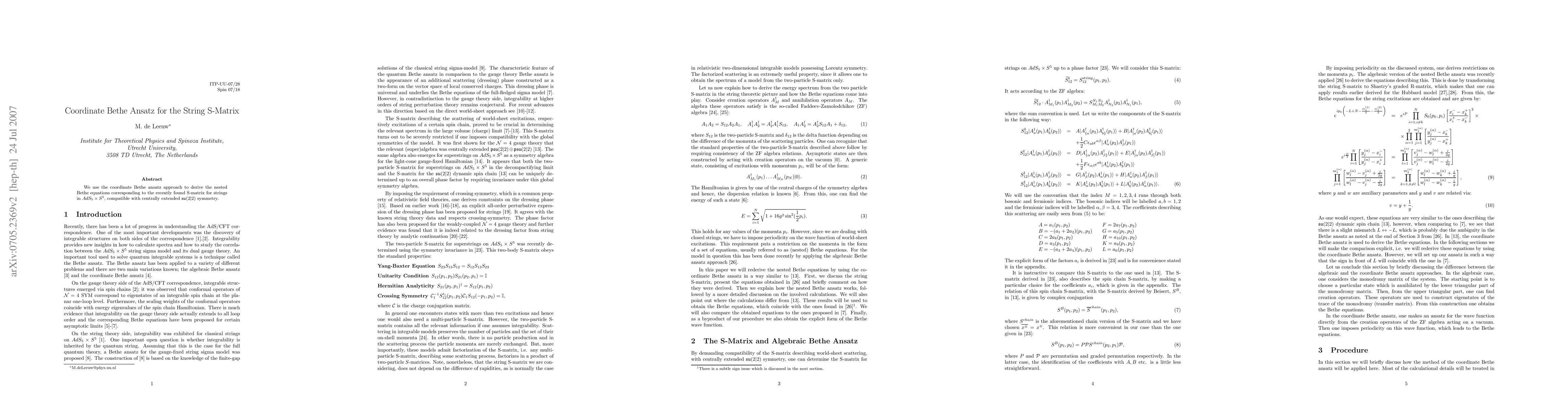 Summary: This paper employs the coordinate Bethe ansatz to derive nested Bethe equations for the string S-matrix in AdS5 x S5, aligning with centrally extended su(2|2) symmetry. The method provides a new framework for understanding scattering processes in this context.