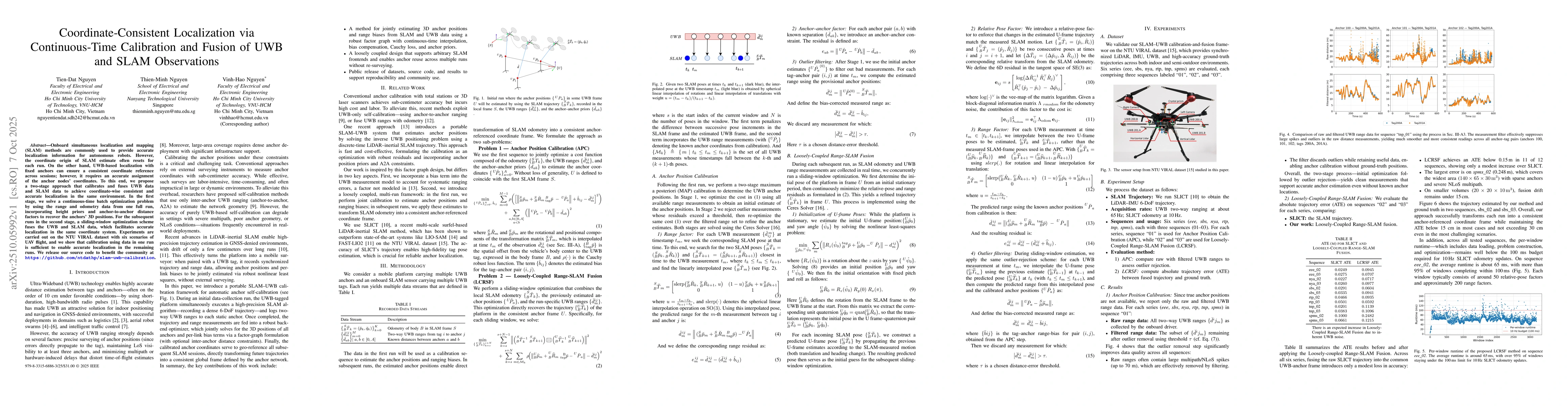 The paper introduces a robust factor graph optimization framework with continuous-time interpolation, bias compensation, and anchor priors for joint calibration of UWB and SLAM data.