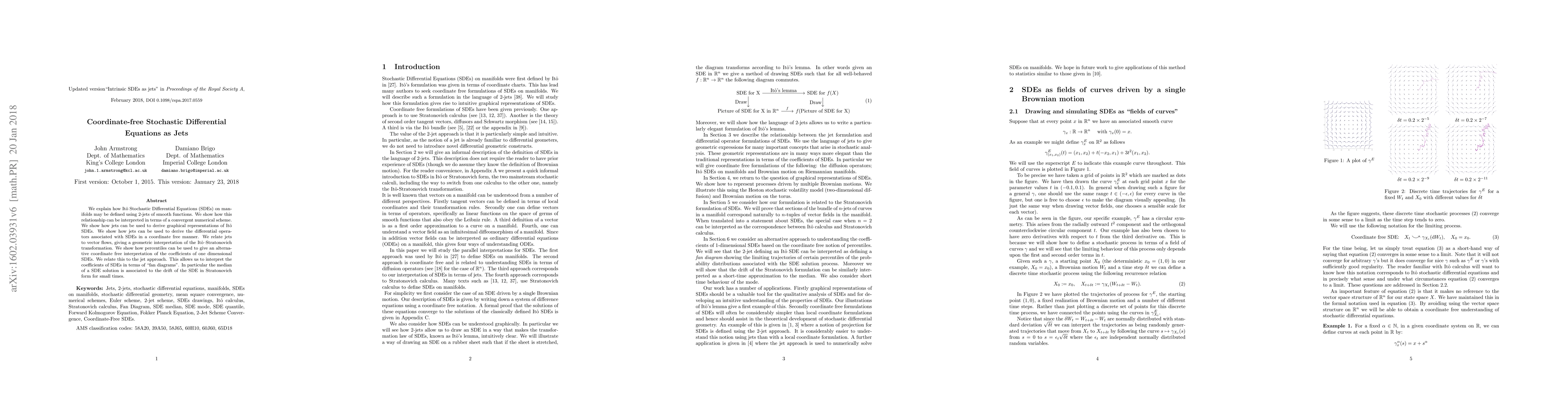 This paper introduces a new way to define stochastic differential equations using jets, providing a coordinate-free approach for interpreting coefficients and graphical representations. It also relates jets to vector flows and percentiles, offering an alternative interpretation of SDEs in terms of 'fan diagrams'.
