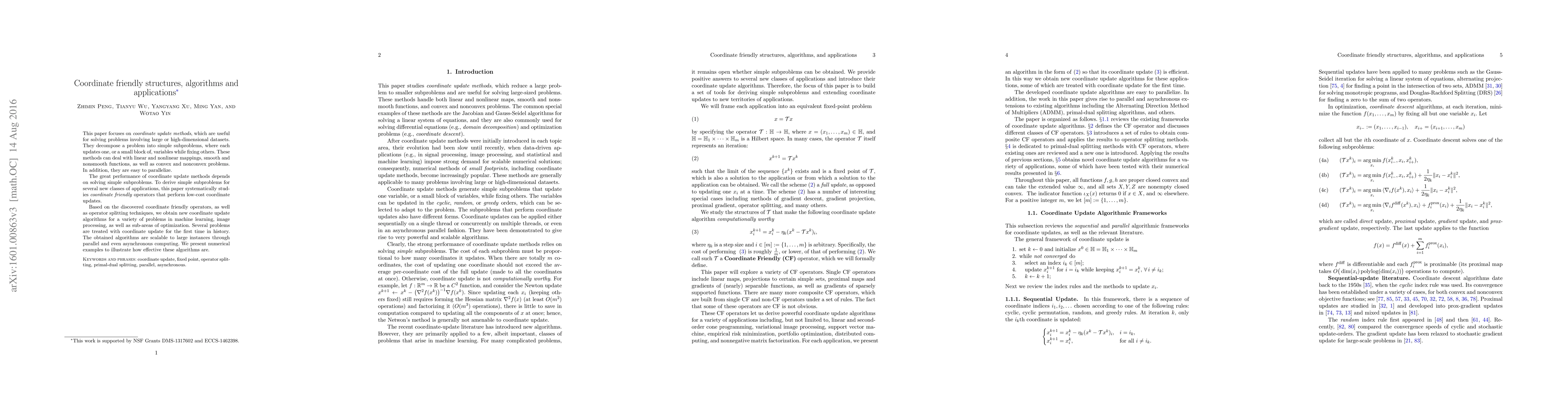This paper develops coordinate update methods for solving large-scale, high-dimensional problems by decomposing them into simpler subproblems. It introduces new coordinate-friendly operators for efficient updates and presents scalable algorithms for machine learning, image processing, and optimization, demonstrating their effectiveness through numerical examples.