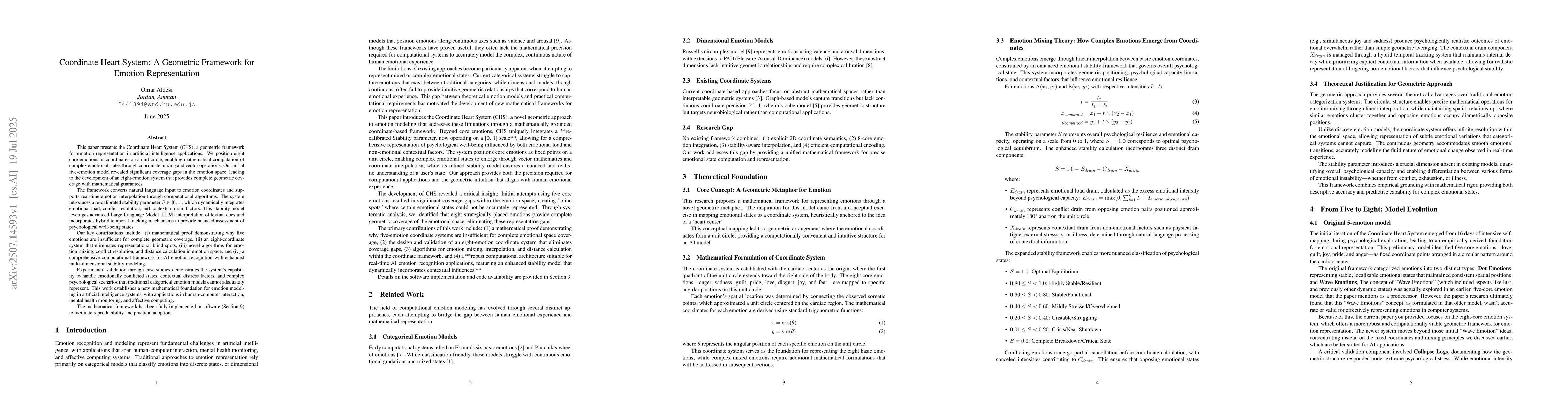 This paper presents the Coordinate Heart System (CHS), a geometric framework for emotion representation in artificial intelligence applications. We position eight core emotions as coordinates on a unit circle, enabling mathematical computation of complex emotional states through coordinate mixing and vector operations. Our initial five-emotion model revealed significant coverage gaps in the emotion space, leading to the development of an eight-emotion system that provides complete geometric coverage with mathematical guarantees. The framework converts natural language input to emotion coordinates and supports real-time emotion interpolation through computational algorithms. The system introduces a re-calibrated stability parameter S in [0,1], which dynamically integrates emotional load, conflict resolution, and contextual drain factors. This stability model leverages advanced Large Language Model interpretation of textual cues and incorporates hybrid temporal tracking mechanisms to provide nuanced assessment of psychological well-being states. Our key contributions include: (i) mathematical proof demonstrating why five emotions are insufficient for complete geometric coverage, (ii) an eight-coordinate system that eliminates representational blind spots, (iii) novel algorithms for emotion mixing, conflict resolution, and distance calculation in emotion space, and (iv) a comprehensive computational framework for AI emotion recognition with enhanced multi-dimensional stability modeling. Experimental validation through case studies demonstrates the system's capability to handle emotionally conflicted states, contextual distress factors, and complex psychological scenarios that traditional categorical emotion models cannot adequately represent. This work establishes a new mathematical foundation for emotion modeling in artificial intelligence systems.