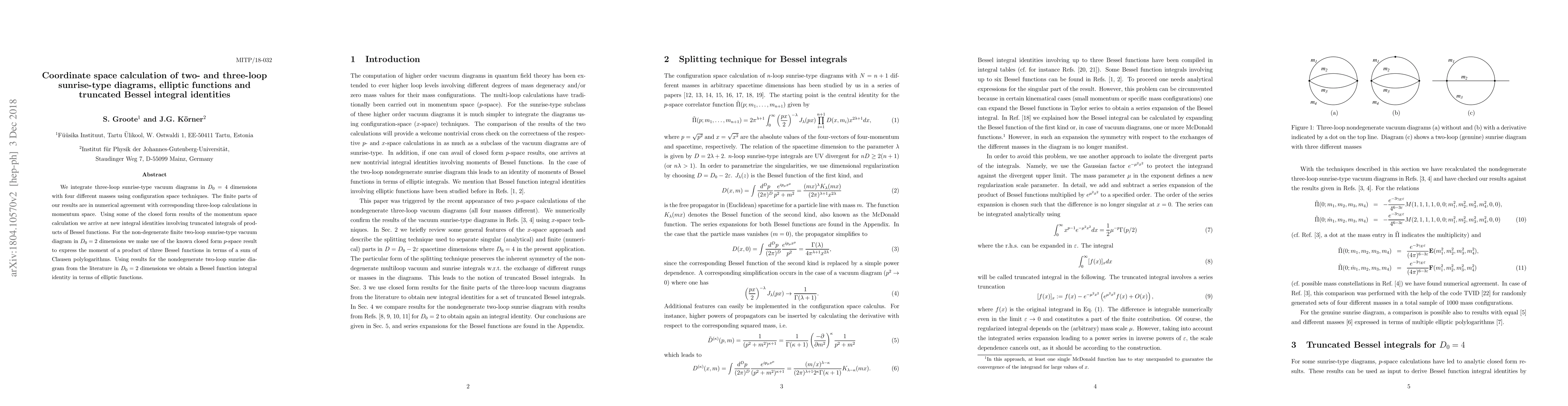 This paper presents configuration space calculations for three-loop sunrise diagrams in four dimensions, verifying results against momentum space computations. It derives new integral identities involving truncated Bessel functions and applies known results to obtain identities for two-loop diagrams in two dimensions, linking Bessel functions to elliptic functions and Claussen polylogarithms.