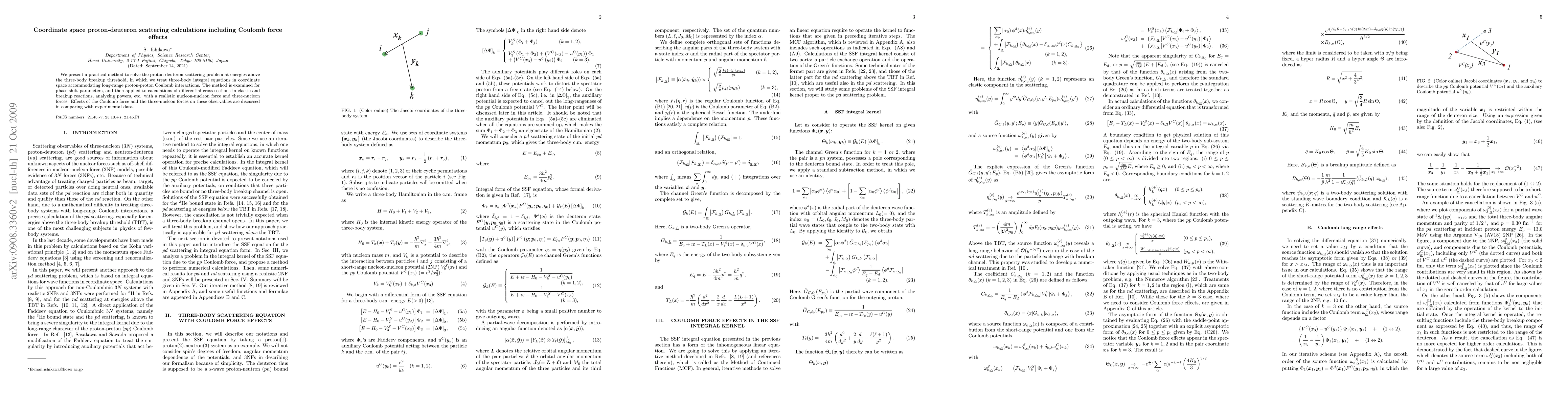 This paper introduces a coordinate space method for proton-deuteron scattering calculations above the breakup threshold, addressing long-range Coulomb interactions and employing realistic nucleon-nucleon and three-nucleon forces. The method's accuracy is evaluated through phase shift parameters and applied to differential cross sections, analyzing powers, and other observables, with a focus on Coulomb and three-nucleon force effects compared to experimental data.