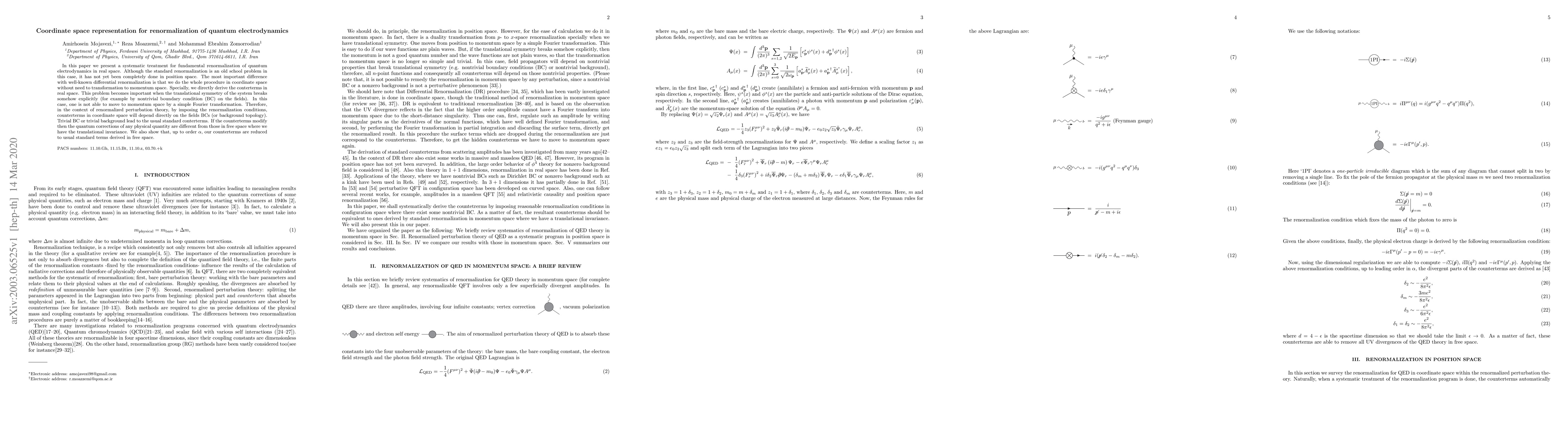 $ $In this paper we present a systematic treatment for fundamental renormalization of quantum electrodynamics in real space. Although the standard renormalization is an old school problem in this case, it has not yet been completely done in position space. The most important difference with well-known differential renormalization is that we do the whole procedure in coordinate space without need to transformation to momentum space. Specially, we directly derive the conterterms in real space. This problem becomes important when the translational symmetry of the system breaks somehow explicitly (for example by nontrivial boundary condition (BC) on the fields). In this case, one is not able to move to momentum space by a simple Fourier transformation. Therefore, in the context of renormalized perturbation theory, by imposing the renormalization conditions, counterterms in coordinate space will depend directly on the fields BCs (or background topology). Trivial BC or trivial background lead to the usual standard conterterms. If the counterterms modify then the quantum corrections of any physical quantity are different from those in free space where we have the translational invariance. We also show that, up to order $\alpha$, our counterterms are reduced to usual standard terms derived in free space.