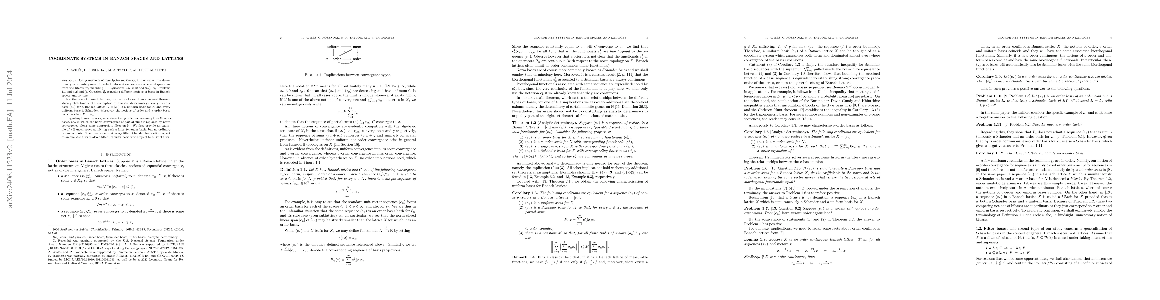 Using methods of descriptive set theory, in particular, the determinacy of infinite games of perfect information, we answer several questions from the literature regarding different notions of bases in Banach spaces and lattices. For the case of Banach lattices, our results follow from a general theorem stating that (under the assumption of projective determinacy), every order basis $(e_n)$ for a Banach lattice $X=[e_n]$ is also a $\sigma$-order basis for $X$, every $\sigma$-order basis for $X$ is a uniform basis for $X$, and every uniform basis is Schauder. Regarding Banach spaces, we address two problems concerning filter Schauder bases for Banach spaces, i.e., in which the norm convergence of partial sums is replaced by norm convergence along some appropriate filter on $\mathbb N$. We first provide an example of a Banach space admitting such a filter Schauder basis, but no ordinary Schauder basis. Secondly, we show that every filter Schauder basis with respect to an analytic filter is also a filter Schauder basis with respect to a Borel filter.