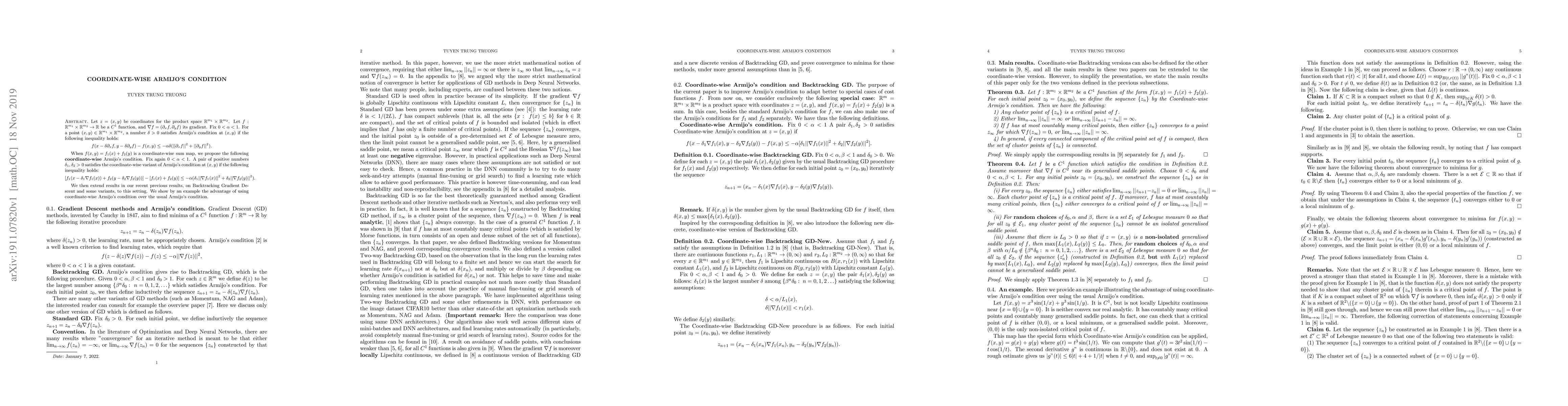 Let $z=(x,y)$ be coordinates for the product space $\mathbb{R}^{m_1}\times \mathbb{R}^{m_2}$. Let $f:\mathbb{R}^{m_1}\times \mathbb{R}^{m_2}\rightarrow \mathbb{R}$ be a $C^1$ function, and $\nabla f=(\partial _xf,\partial _yf)$ its gradient. Fix $0<\alpha <1$. For a point $(x,y) \in \mathbb{R}^{m_1}\times \mathbb{R}^{m_2}$, a number $\delta >0$ satisfies Armijo's condition at $(x,y)$ if the following inequality holds: \begin{eqnarray*} f(x-\delta \partial _xf,y-\delta \partial _yf)-f(x,y)\leq -\alpha \delta (||\partial _xf||^2+||\partial _yf||^2). \end{eqnarray*} When $f(x,y)=f_1(x)+f_2(y)$ is a coordinate-wise sum map, we propose the following {\bf coordinate-wise} Armijo's condition. Fix again $0<\alpha <1$. A pair of positive numbers $\delta _1,\delta _2>0$ satisfies the coordinate-wise variant of Armijo's condition at $(x,y)$ if the following inequality holds: \begin{eqnarray*} [f_1(x-\delta _1\nabla f_1(x))+f_2(y-\delta _2\nabla f_2(y))]-[f_1(x)+f_2(y)]\leq -\alpha (\delta _1||\nabla f_1(x)||^2+\delta _2||\nabla f_2(y)||^2). \end{eqnarray*} We then extend results in our recent previous results, on Backtracking Gradient Descent and some variants, to this setting. We show by an example the advantage of using coordinate-wise Armijo's condition over the usual Armijo's condition.