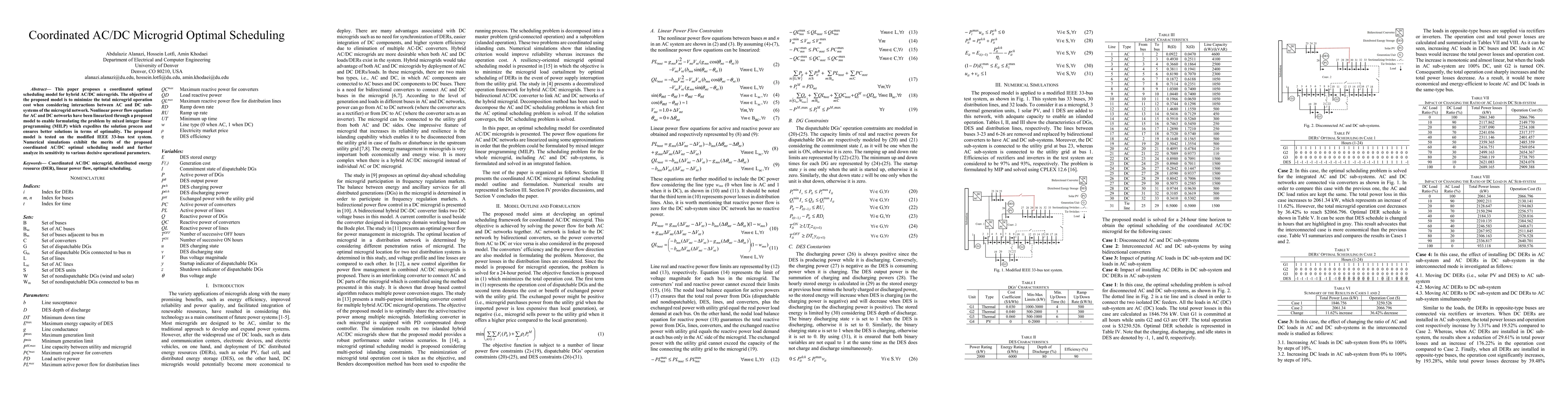 This paper presents a coordinated optimal scheduling model for hybrid AC/DC microgrids, aiming to minimize operation costs by linearizing nonlinear power flow equations and formulating the problem using mixed integer linear programming (MILP). The model is tested on a modified IEEE 33-bus system, demonstrating its effectiveness through numerical simulations.
