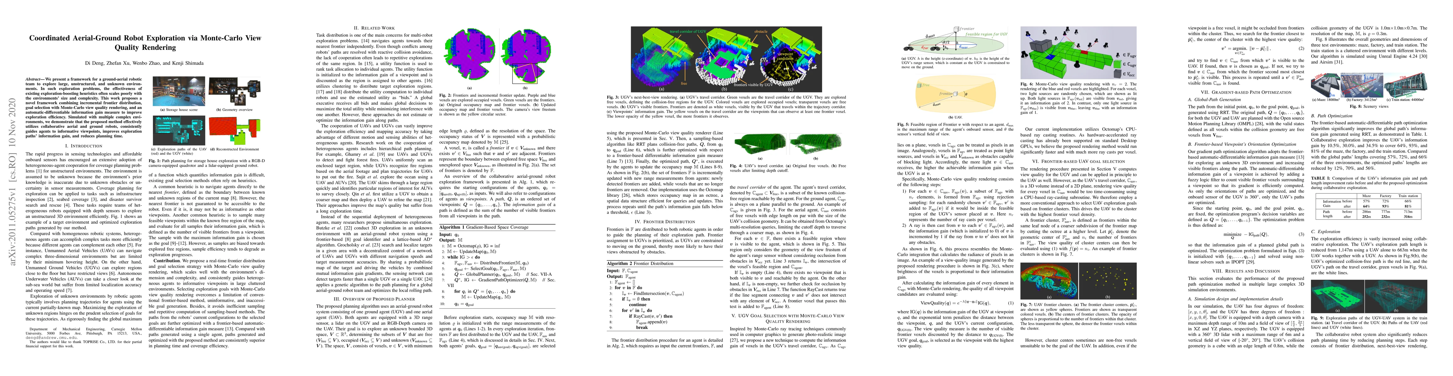 This paper introduces a framework for a coordinated ground-aerial robot team to efficiently explore large, complex environments using incremental frontier distribution, Monte-Carlo view quality rendering, and an automatic-differentiable information gain measure, demonstrating improved exploration efficiency and reduced planning time in simulations.