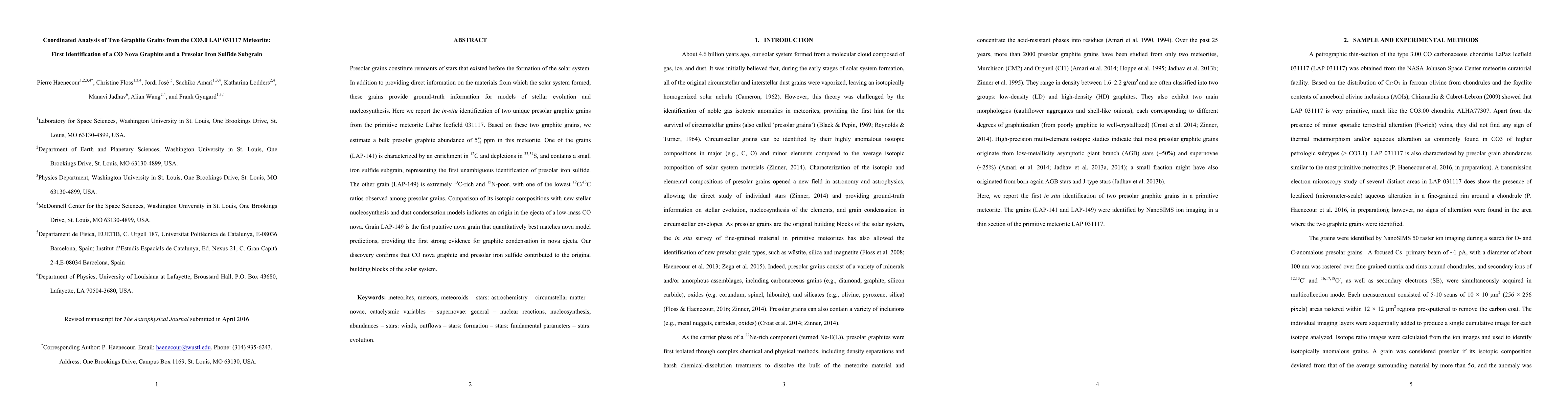 This research identifies two unique presolar graphite grains in the LaPaz Icefield 031117 meteorite, revealing the first unambiguous presolar iron sulfide subgrain. One grain suggests a low-mass CO nova origin, providing strong evidence for graphite condensation in nova ejecta.
