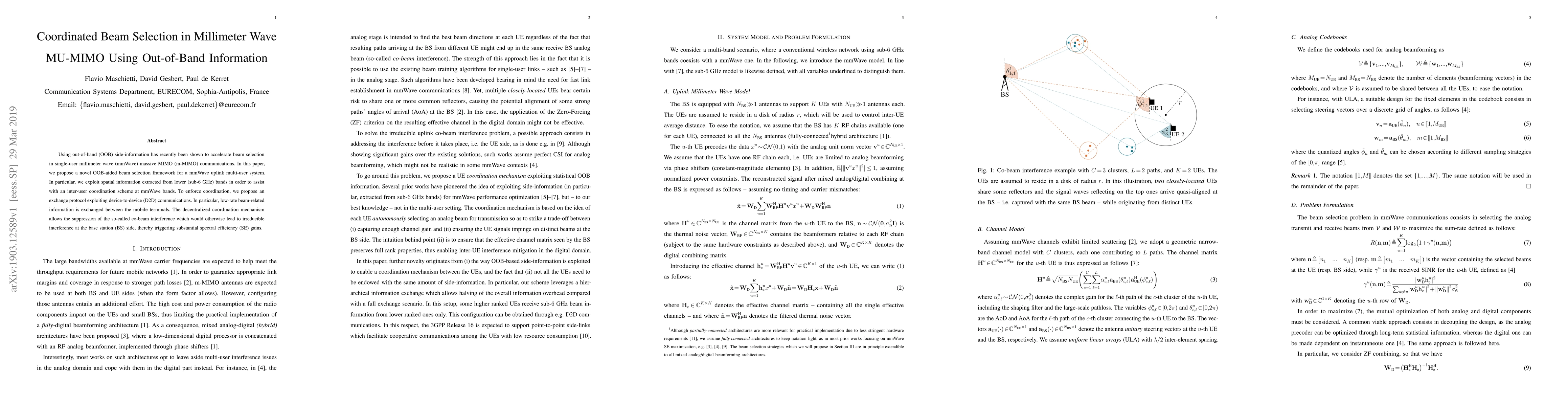This paper proposes an OOB-aided beam selection framework for mmWave multi-user MIMO systems, leveraging spatial information from sub-6 GHz bands to assist coordination. A decentralized exchange protocol using device-to-device communications suppresses co-beam interference, enhancing spectral efficiency.