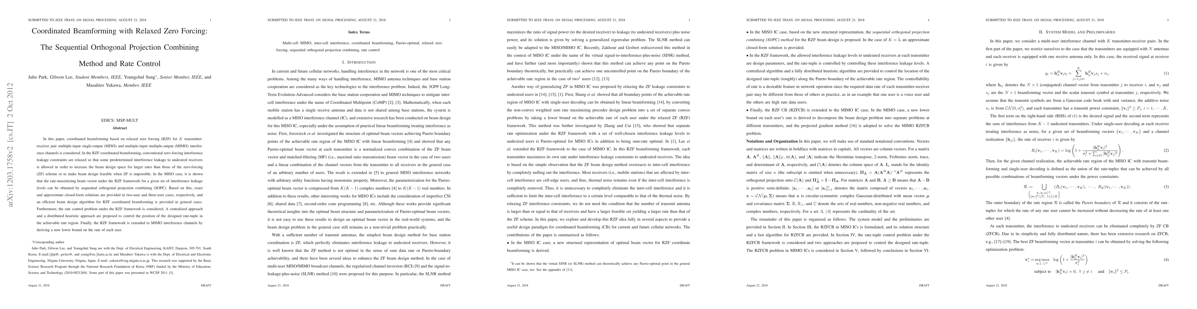 This paper explores coordinated beamforming using relaxed zero forcing (RZF) for MISO and MIMO interference channels, allowing some interference leakage to enhance achievable rates. It introduces the sequential orthogonal projection combining (SOPC) method for rate-maximizing beam design and proposes centralized and distributed approaches for rate control.