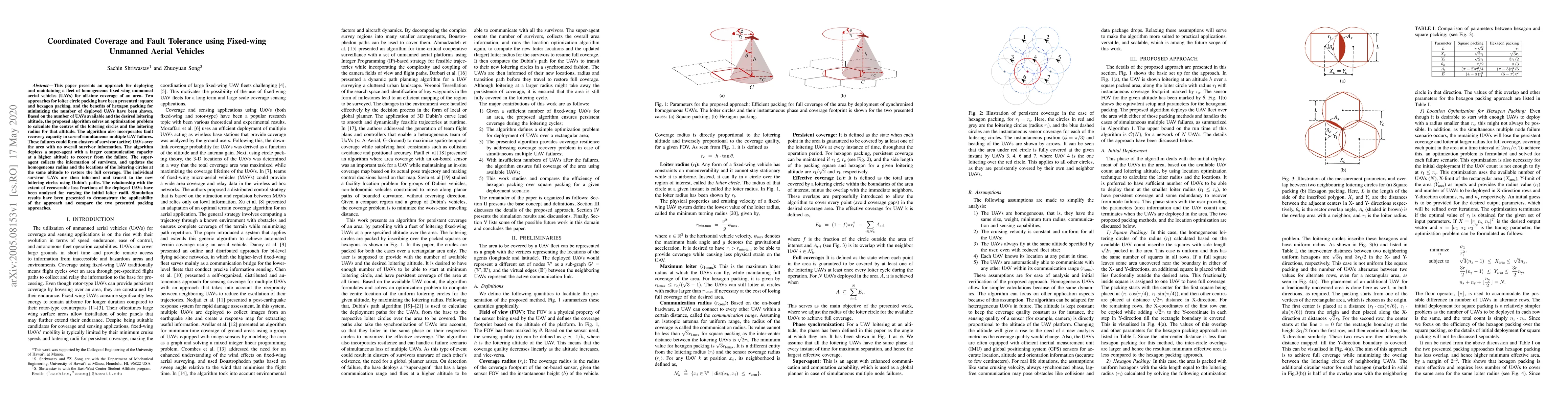 This paper presents an approach for deploying and maintaining a fleet of homogeneous fixed-wing unmanned aerial vehicles (UAVs) for all-time coverage of an area. Two approaches for loiter circle packing have been presented: square and hexagon packing, and the benefits of hexagon packing for minimizing the number of deployed UAVs have been shown. Based on the number of UAVs available and the desired loitering altitude, the proposed algorithm solves an optimization problem to calculate the centres of the loitering circles and the loitering radius for that altitude. The algorithm also incorporates fault recovery capacity in case of simultaneous multiple UAV failures. These failures could form clusters of survivor (active) UAVs over the area with no overall survivor information. The algorithm deploys a super-agent with a larger communication capacity at a higher altitude to recover from the failure. The super-agent collects the information of survivors, and updates the homogeneous radius and the locations of the loitering circles at the same altitude to restore the full coverage. The individual survivor UAVs are then informed and transit to the new loitering circles using Dubin's paths. The relationship with the extent of recoverable loss fractions of the deployed UAVs have been analysed for varying the initial loiter radii. Simulation results have been presented to demonstrate the applicability of the approach and compare the two presented packing approaches.