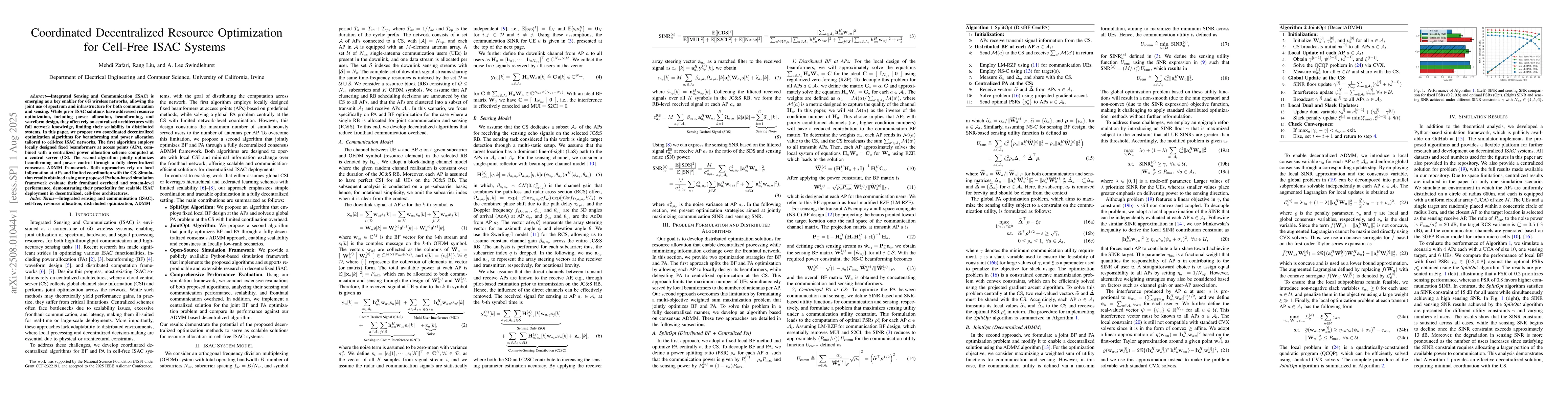 Integrated Sensing and Communication (ISAC) is emerging as a key enabler for 6G wireless networks, allowing the joint use of spectrum and infrastructure for both communication and sensing. While prior ISAC solutions have addressed resource optimization, including power allocation, beamforming, and waveform design, they often rely on centralized architectures with full network knowledge, limiting their scalability in distributed systems. In this paper, we propose two coordinated decentralized optimization algorithms for beamforming and power allocation tailored to cell-free ISAC networks. The first algorithm employs locally designed fixed beamformers at access points (APs), combined with a centralized power allocation scheme computed at a central server (CS). The second algorithm jointly optimizes beamforming and power control through a fully decentralized consensus ADMM framework. Both approaches rely on local information at APs and limited coordination with the CS. Simulation results obtained using our proposed Python-based simulation framework evaluate their fronthaul overhead and system-level performance, demonstrating their practicality for scalable ISAC deployment in decentralized, cell-free architectures.