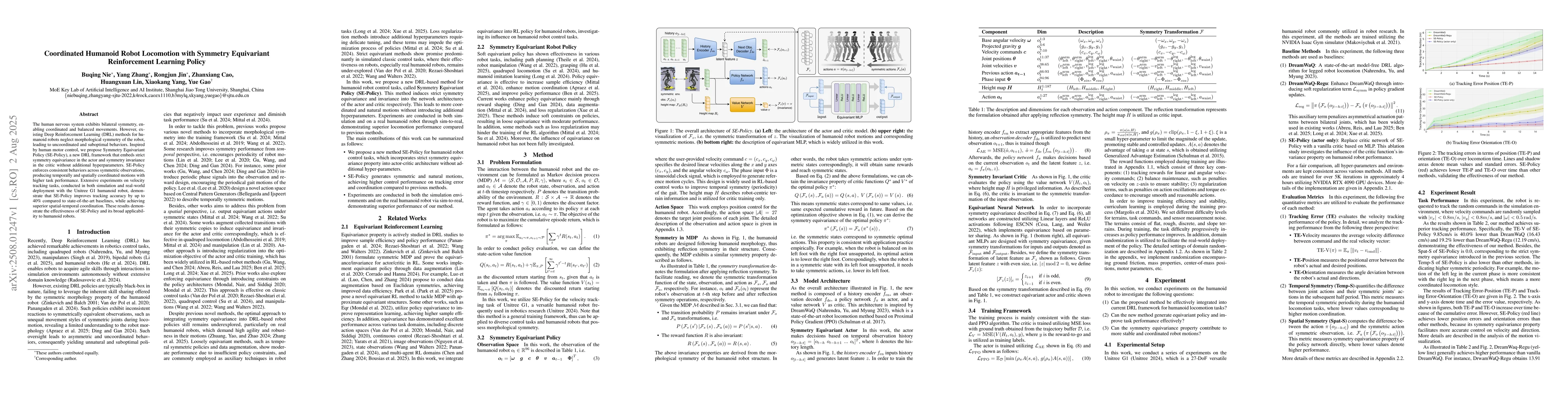 The human nervous system exhibits bilateral symmetry, enabling coordinated and balanced movements. However, existing Deep Reinforcement Learning (DRL) methods for humanoid robots neglect morphological symmetry of the robot, leading to uncoordinated and suboptimal behaviors. Inspired by human motor control, we propose Symmetry Equivariant Policy (SE-Policy), a new DRL framework that embeds strict symmetry equivariance in the actor and symmetry invariance in the critic without additional hyperparameters. SE-Policy enforces consistent behaviors across symmetric observations, producing temporally and spatially coordinated motions with higher task performance. Extensive experiments on velocity tracking tasks, conducted in both simulation and real-world deployment with the Unitree G1 humanoid robot, demonstrate that SE-Policy improves tracking accuracy by up to 40% compared to state-of-the-art baselines, while achieving superior spatial-temporal coordination. These results demonstrate the effectiveness of SE-Policy and its broad applicability to humanoid robots.