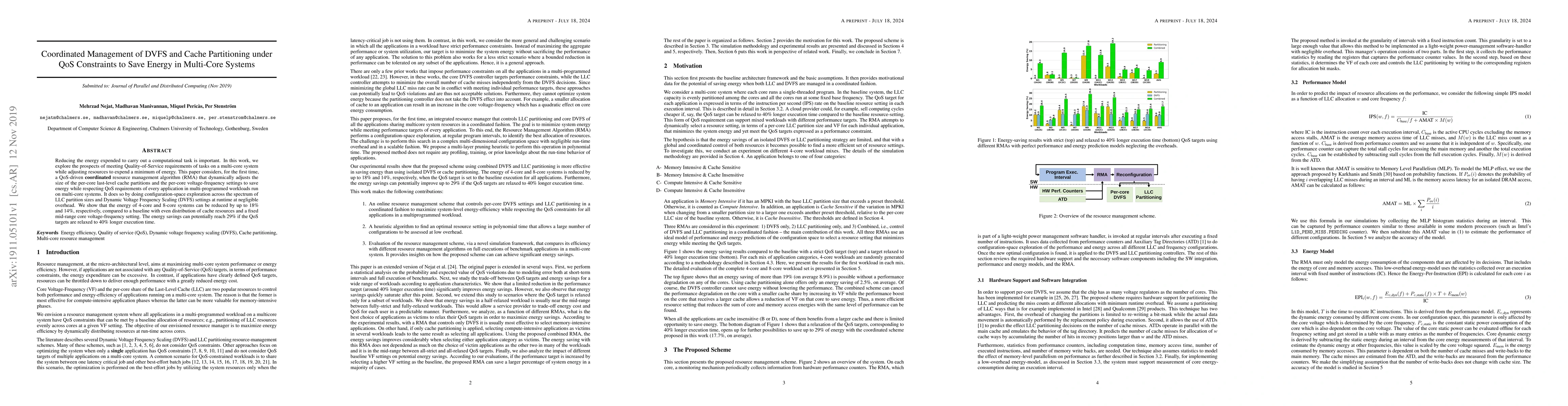 This paper proposes a QoS-driven coordinated resource management algorithm that dynamically adjusts cache partitioning and DVFS settings to minimize energy consumption in multi-core systems while meeting application QoS requirements. The algorithm achieves up to 18% and 14% energy savings in 4-core and 8-core systems, respectively, compared to a baseline approach.