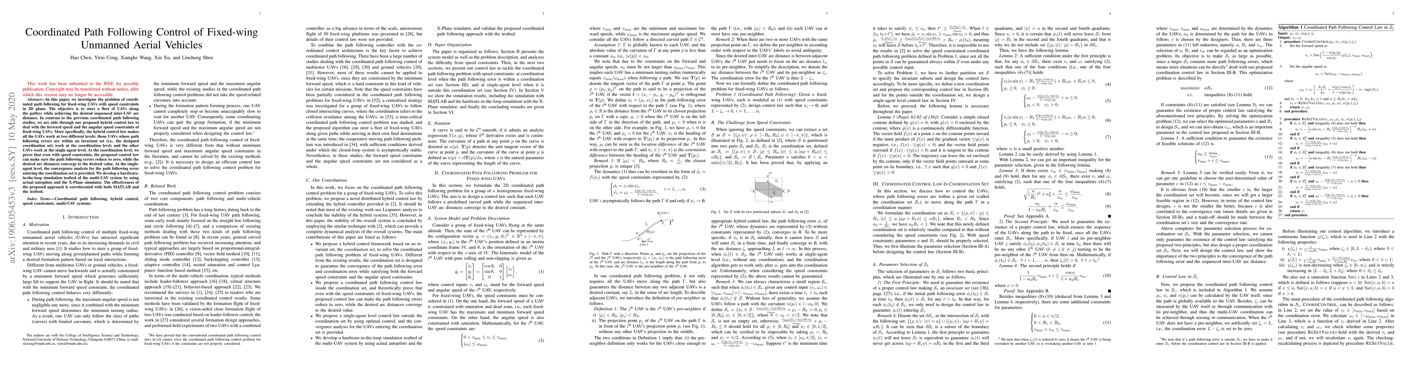 This paper proposes a hybrid control law for coordinated path following of fixed-wing UAVs in 2D, addressing speed constraints and ensuring desired inter-UAV distances. The control law operates at two levels, achieving zero path following errors and convergence to desired arc distances.