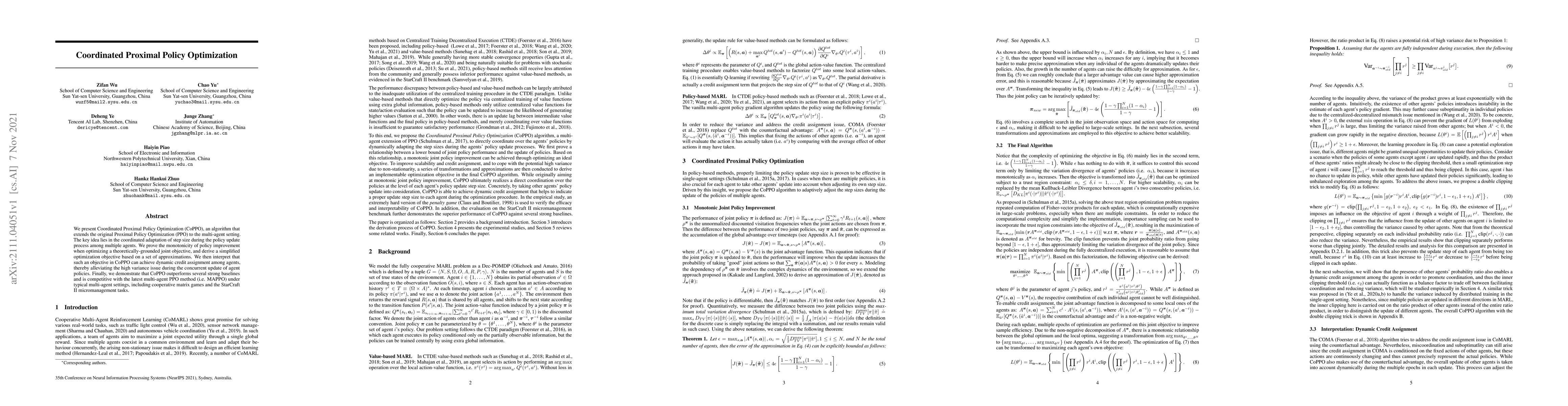 Coordinated Proximal Policy Optimization (CoPPO) extends Proximal Policy Optimization to multi-agent systems by coordinating step size adaptation among agents, achieving dynamic credit assignment and improved policy convergence. CoPPO outperforms baselines and is competitive with MAPPO in multi-agent scenarios.