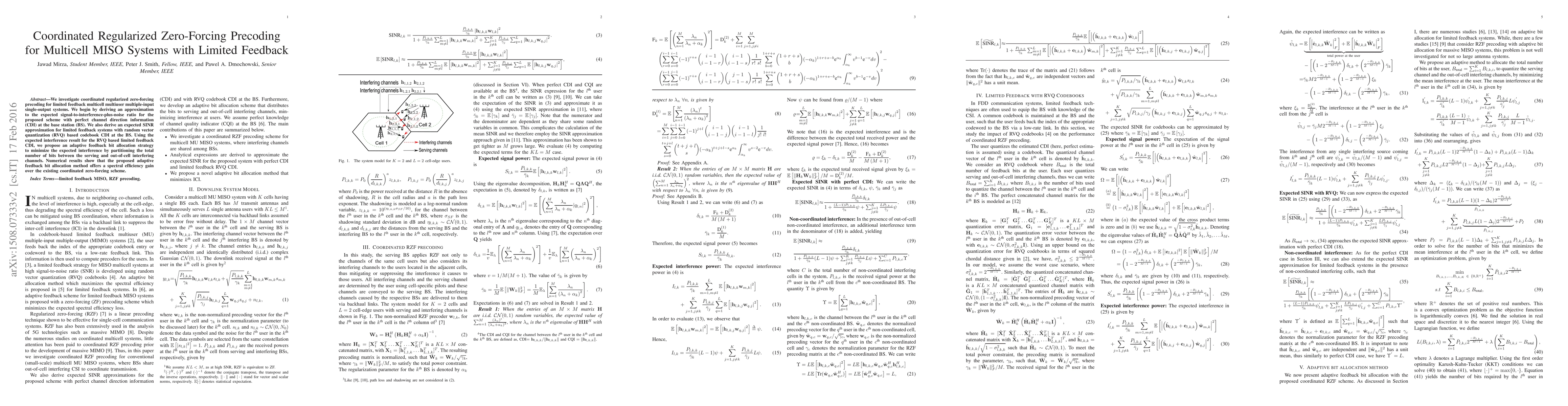 This paper proposes a coordinated regularized zero-forcing precoding method for multicell multiuser MISO systems, optimizing limited feedback through adaptive bit allocation to minimize interference. The study compares performance under perfect and limited channel state information, demonstrating improved spectral efficiency.