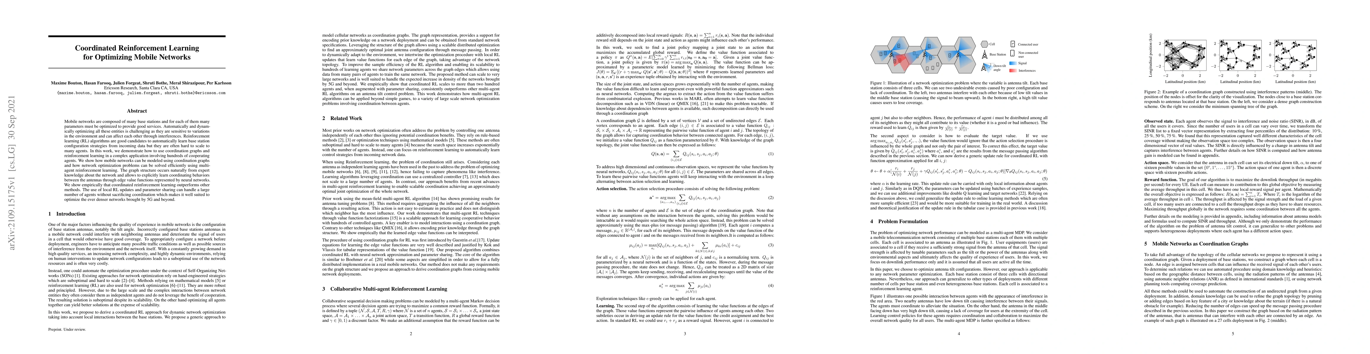 This paper explores the application of coordinated reinforcement learning to optimize mobile networks by using coordination graphs to model interactions between base stations. It demonstrates that this approach efficiently handles large-scale optimization problems, outperforming other methods and enabling scalable solutions for dense 5G networks.