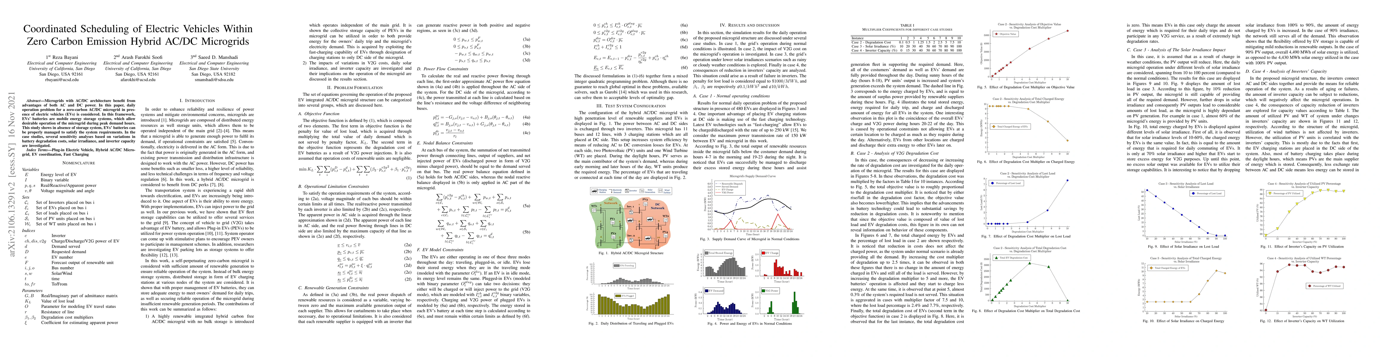 This paper explores the daily scheduling of a zero-carbon hybrid AC/DC microgrid incorporating electric vehicles (EVs) as mobile energy storage. It demonstrates that EVs' batteries can effectively manage peak demand without a traditional storage system, and conducts sensitivity analyses on battery degradation costs, solar irradiance, and inverter capacity.