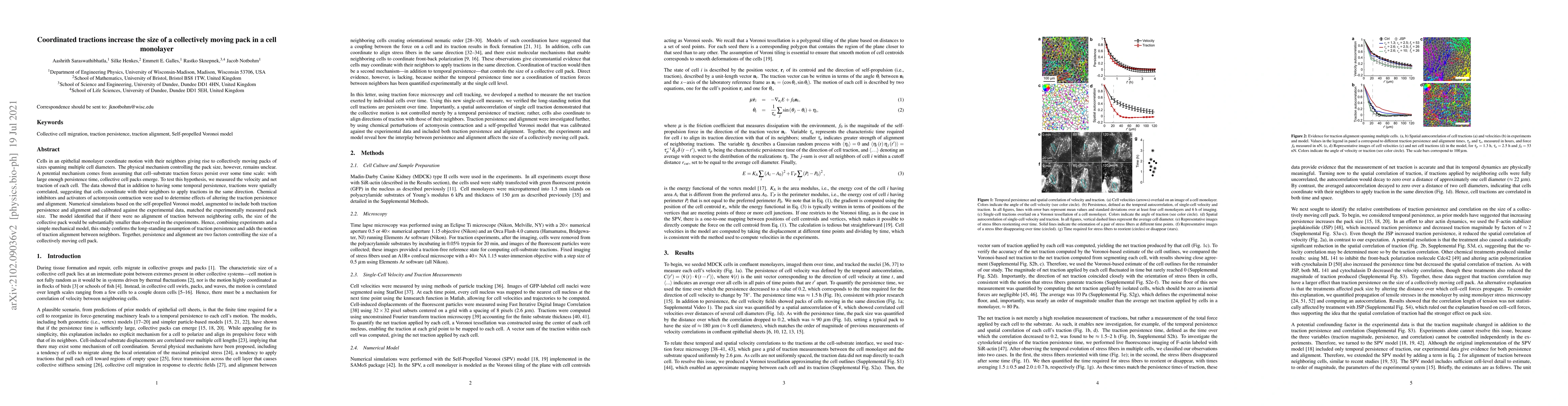 This study combines experiments and a mechanical model to show that both traction persistence and alignment between neighboring cells control the size of collectively moving cell packs in an epithelial monolayer. Altering actomyosin contraction with inhibitors and activators confirmed these factors' roles.