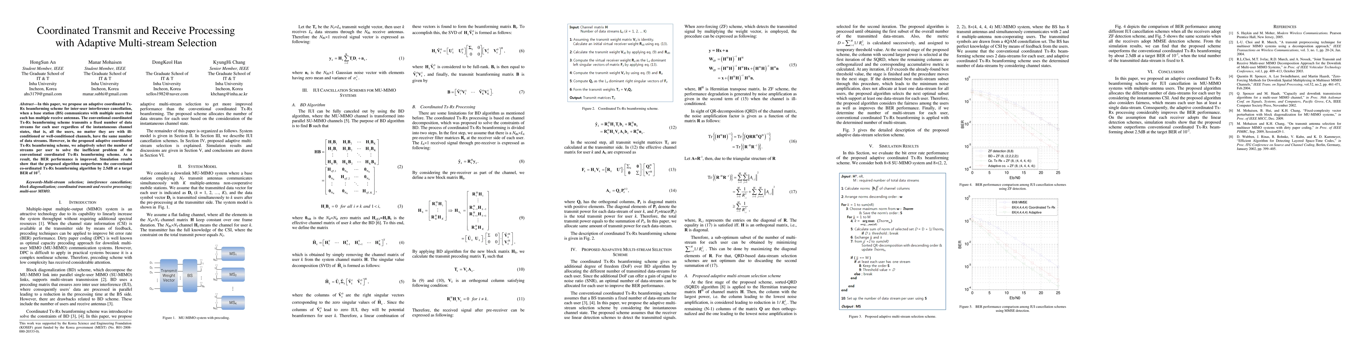 In this paper, we propose an adaptive coordinated Tx-Rx beamforming scheme for inter-user interference cancellation, when a base station (BS) communicates with multiple users that each has multiple receive antennas. The conventional coordinated Tx-Rx beamforming scheme transmits a fixed number of data streams for each user regardless of the instantaneous channel states, that is, all the users, no matter they are with ill-conditioned or well-conditioned channels, have the same number of data streams. However, in the proposed adaptive coordinated Tx-Rx beamforming scheme, we adaptively select the number of streams per user to solve the inefficient problem of the conventional coordinated Tx-Rx beamforming scheme. As a result, the BER performance is improved. Simulation results show that the proposed algorithm outperforms the conventional co-ordinated Tx-Rx beamforming algorithm by 2.5dB at a target BER of 10^-2