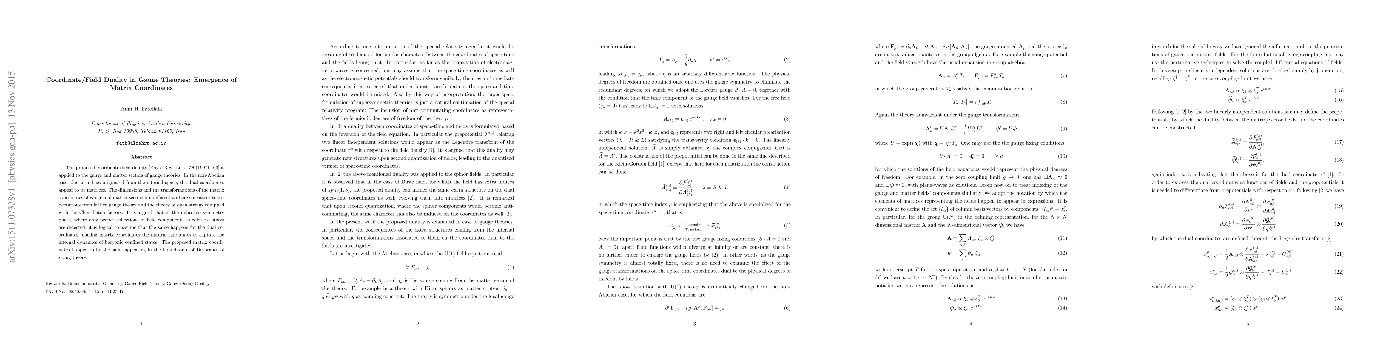 This paper explores the application of coordinate/field duality in gauge theories, revealing that dual coordinates emerge as matrices in the non-Abelian case, consistent with lattice gauge theory and open string theory. It posits that matrix coordinates are suitable for describing the internal dynamics of baryonic confined states and align with those found in D0-branes in string theory.