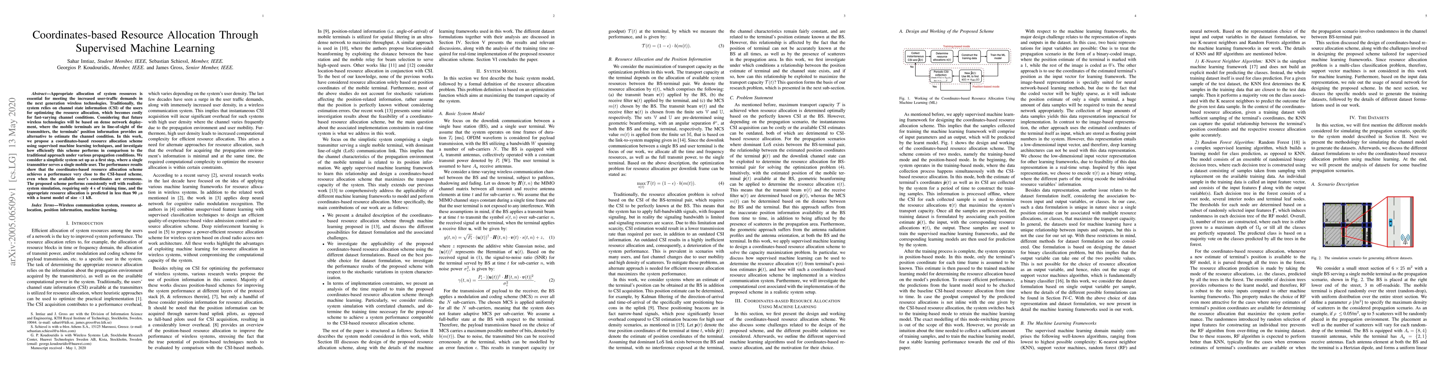 Appropriate allocation of system resources is essential for meeting the increased user-traffic demands in the next generation wireless technologies. Traditionally, the system relies on channel state information (CSI) of the users for optimizing the resource allocation, which becomes costly for fast-varying channel conditions. Considering that future wireless technologies will be based on dense network deployment, where the mobile terminals are in line-of-sight of the transmitters, the position information of terminals provides an alternative to estimate the channel condition. In this work, we propose a coordinates-based resource allocation scheme using supervised machine learning techniques, and investigate how efficiently this scheme performs in comparison to the traditional approach under various propagation conditions. We consider a simplistic system set up as a first step, where a single transmitter serves a single mobile user. The performance results show that the coordinates-based resource allocation scheme achieves a performance very close to the CSI-based scheme, even when the available coordinates of terminals are erroneous. The proposed scheme performs consistently well with realistic-system simulation, requiring only 4 s of training time, and the appropriate resource allocation is predicted in less than 90 microseconds with a learnt model of size less than 1 kB.