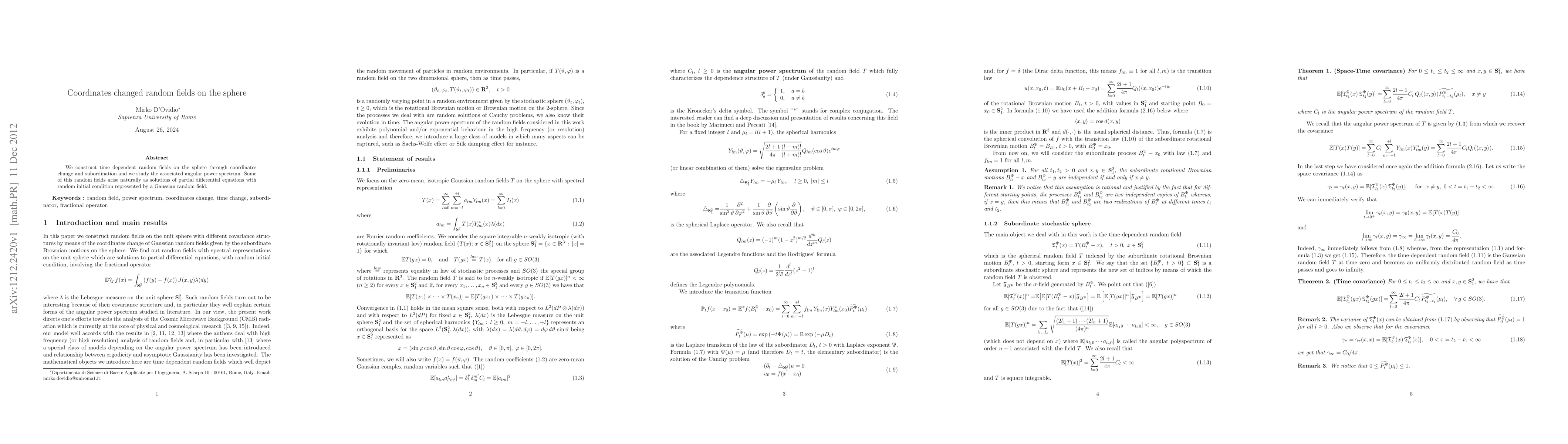 This paper constructs time-dependent random fields on the sphere via coordinate transformations and subordination, analyzing their angular power spectrum. Some fields emerge as solutions to partial differential equations with Gaussian random initial conditions.