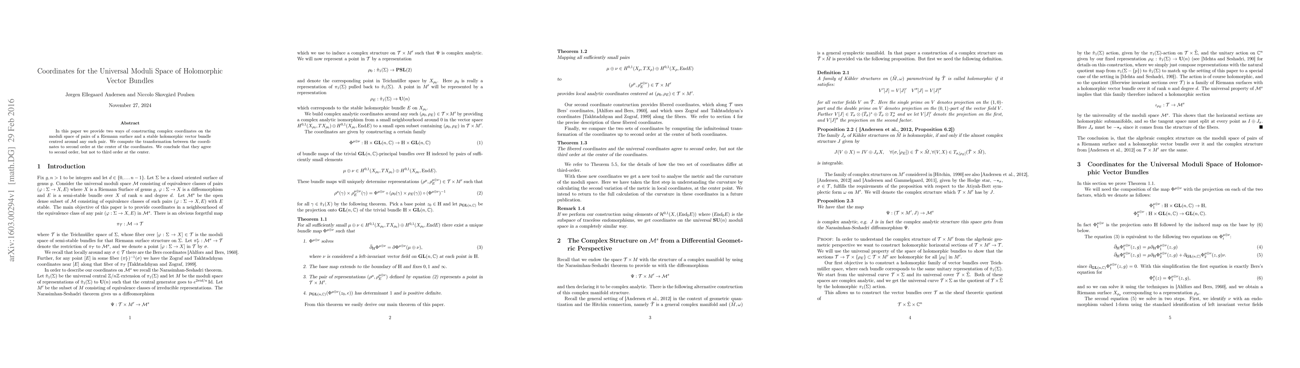 In this paper we provide two ways of constructing complex coordinates on the moduli space of pairs of a Riemann surface and a stable holomorphic vector bundle centred around any such pair. We compute the transformation between the coordinates to second order at the center of the coordinates. We conclude that they agree to second order, but not to third order at the center.