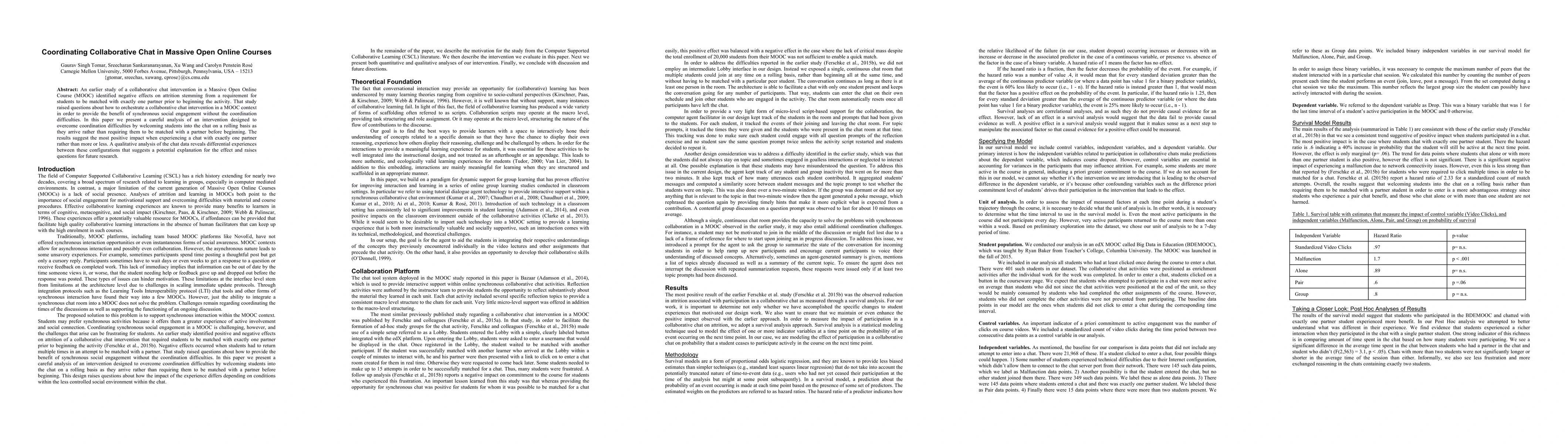 A study found that in a Massive Open Online Course (MOOC), coordinating collaborative chat interventions with exactly one partner had the most positive impact on students, while welcoming students into the chat without pairing them up was less effective. The results suggest a potential explanation for this effect and raise questions for future research.