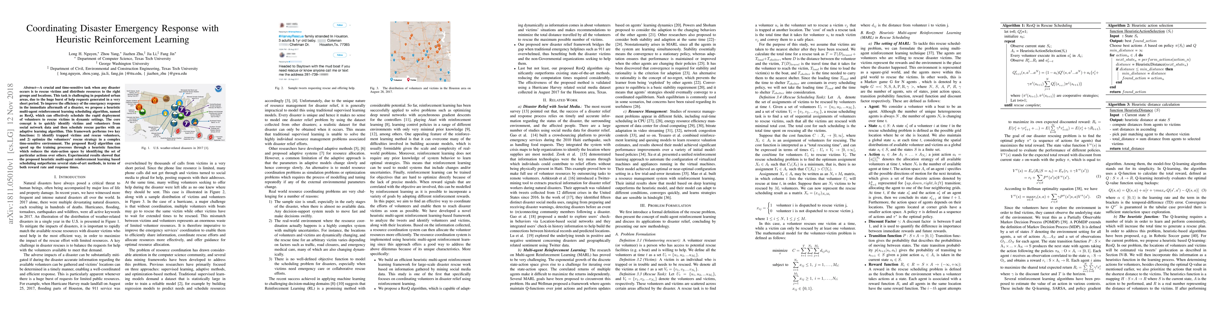This paper proposes a heuristic multi-agent reinforcement learning algorithm, ResQ, to optimize disaster emergency response by rapidly deploying volunteers to rescue victims. The algorithm identifies victims and volunteers from social network data, optimizing rescue strategies in dynamic urban environments, and outperforms state-of-the-art methods in reward rate and response times.
