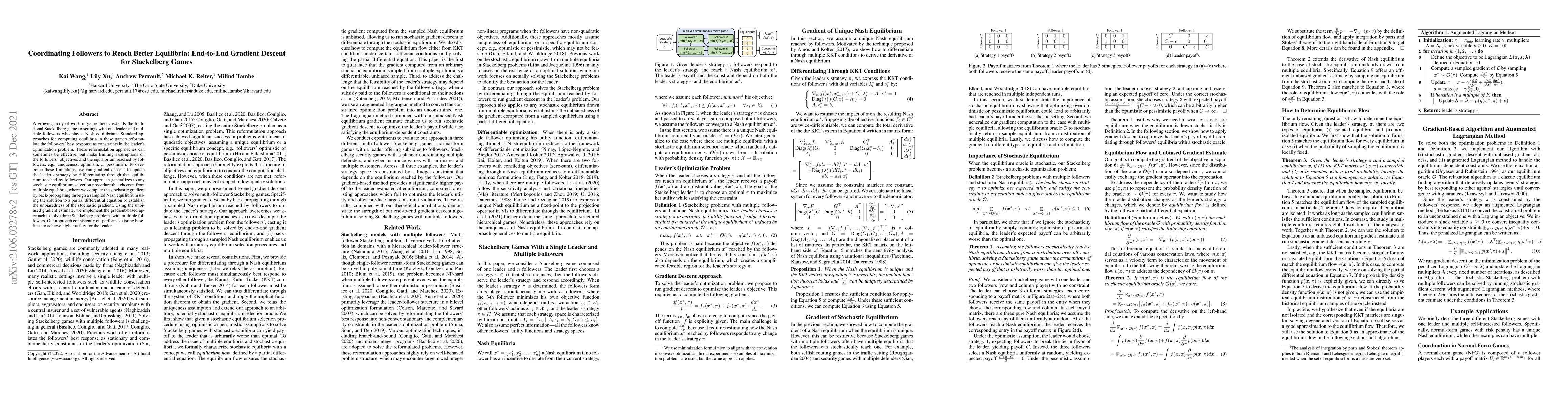 A growing body of work in game theory extends the traditional Stackelberg game to settings with one leader and multiple followers who play a Nash equilibrium. Standard approaches for computing equilibria in these games reformulate the followers' best response as constraints in the leader's optimization problem. These reformulation approaches can sometimes be effective, but often get trapped in low-quality solutions when followers' objectives are non-linear or non-quadratic. Moreover, these approaches assume a unique equilibrium or a specific equilibrium concept, e.g., optimistic or pessimistic, which is a limiting assumption in many situations. To overcome these limitations, we propose a stochastic gradient descent--based approach, where the leader's strategy is updated by differentiating through the followers' best responses. We frame the leader's optimization as a learning problem against followers' equilibrium, which allows us to decouple the followers' equilibrium constraints from the leader's problem. This approach also addresses cases with multiple equilibria and arbitrary equilibrium selection procedures by back-propagating through a sampled Nash equilibrium. To this end, this paper introduces a novel concept called equilibrium flow to formally characterize the set of equilibrium selection processes where the gradient with respect to a sampled equilibrium is an unbiased estimate of the true gradient. We evaluate our approach experimentally against existing baselines in three Stackelberg problems with multiple followers and find that in each case, our approach is able to achieve higher utility for the leader.
