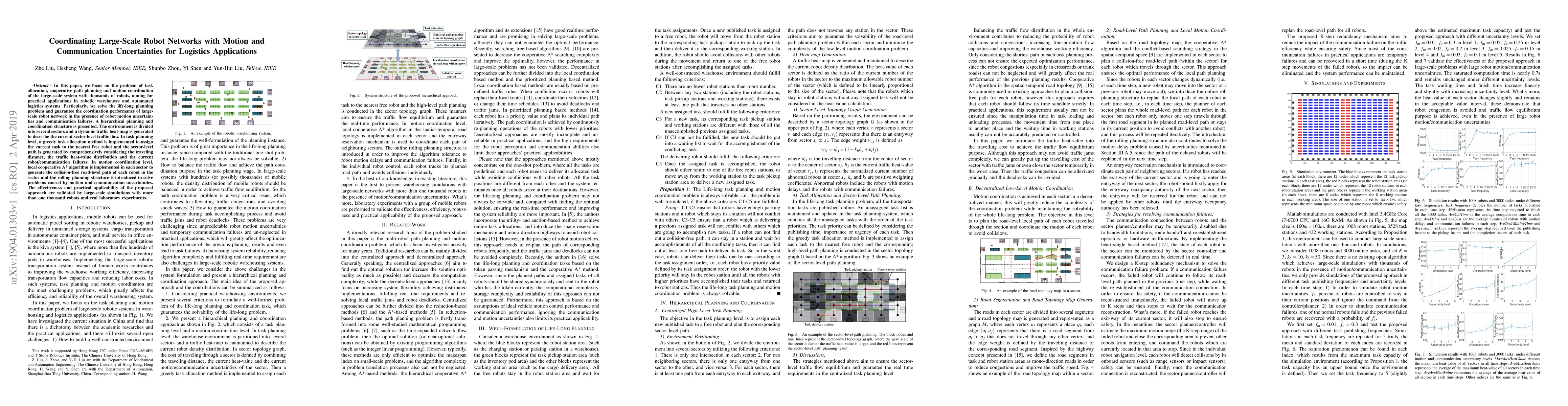 In this paper, we focus on the problem of task allocation, cooperative path planning and motion coordination of the large-scale system with thousands of robots, aiming for practical applications in robotic warehouses and automated logistics systems. Particularly, we solve the life-long planning problem and guarantee the coordination performance of large-scale robot network in the presence of robot motion uncertainties and communication failures. A hierarchical planning and coordination structure is presented. The environment is divided into several sectors and a dynamic traffic heat-map is generated to describe the current sector-level traffic flow. In task planning level, a greedy task allocation method is implemented to assign the current task to the nearest free robot and the sector-level path is generated by comprehensively considering the traveling distance, the traffic heat-value distribution and the current robot/communication failures. In motion coordination level, local cooperative A* algorithm is implemented in each sector to generate the collision-free road-level path of each robot in the sector and the rolling planning structure is introduced to solve problems caused by motion and communication uncertainties. The effectiveness and practical applicability of the proposed approach are validated by large-scale simulations with more than one thousand robots and real laboratory experiments.