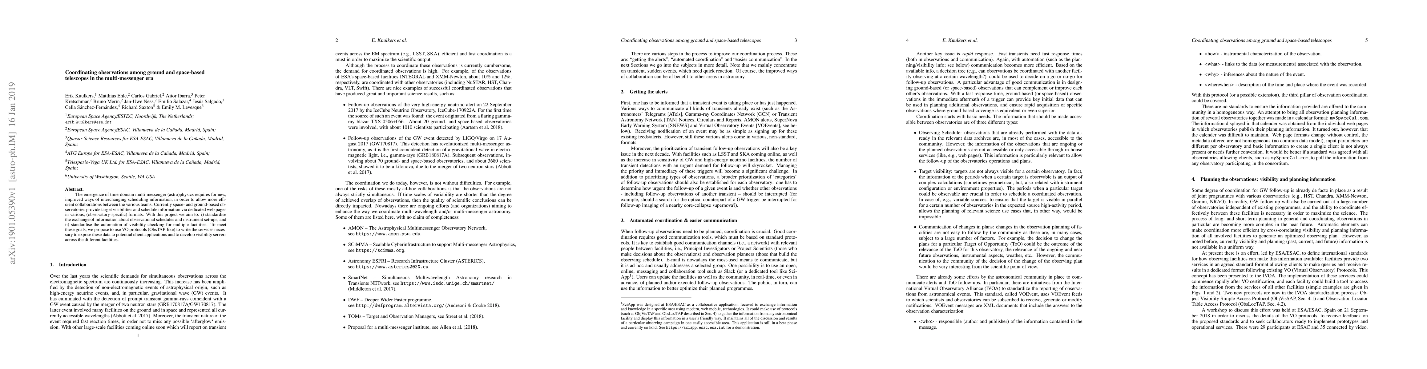 The emergence of time-domain multi-messenger (astro)physics requires for new, improved ways of interchanging scheduling information, in order to allow more efficient collaborations between the various teams. Currently space- and ground-based observatories provide target visibilities and schedule information via dedicated web pages in various, (observatory-specific) formats. With this project we aim to: i) standardise the exchange of information about observational schedules and instrument set-ups, and ii) standardise the automation of visibility checking for multiple facilities. To meet these goals, we propose to use VO protocols (ObsTAP-like) to write the services necessary to expose these data to potential client applications and to develop visibility servers across the different facilities.