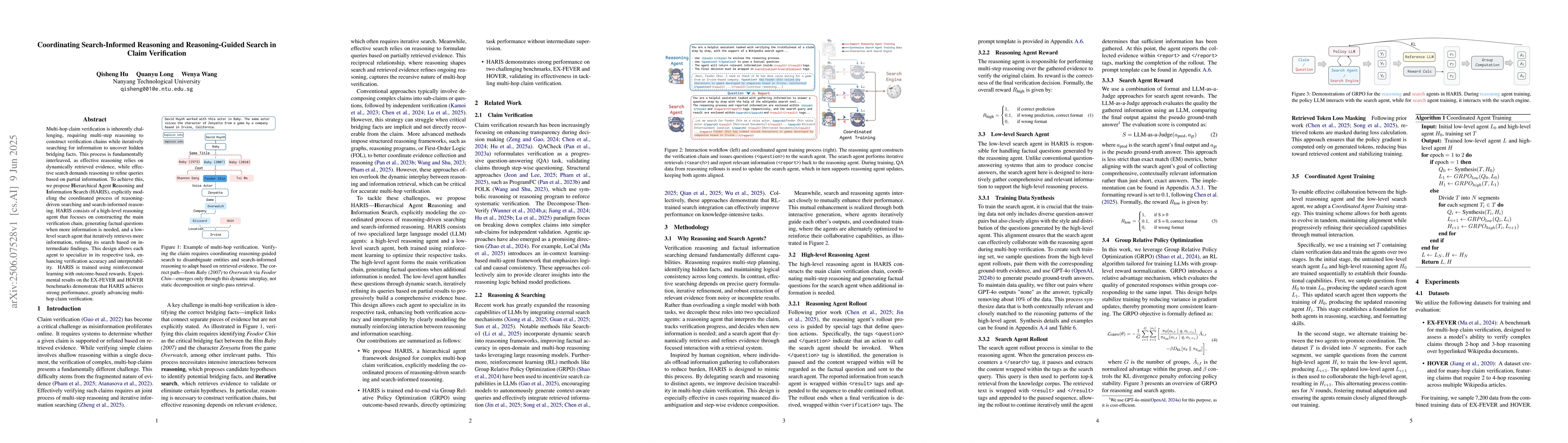 A new method called Hierarchical Agent Reasoning and Information Search (HARIS) improves multi-hop claim verification accuracy and interpretability by coordinating search-informed reasoning and reasoning-guided search. HARIS achieves strong performance on benchmarks, advancing the field of multi-hop claim verification.
