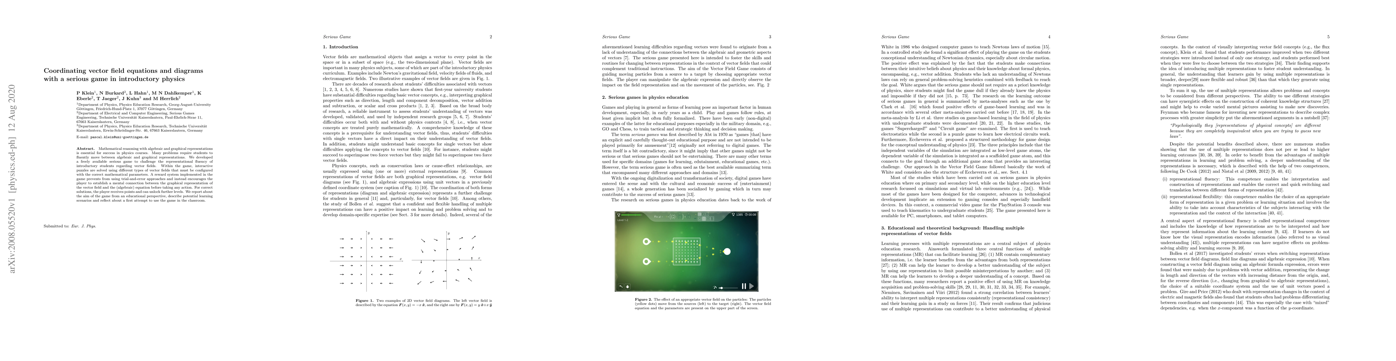 This research paper describes a serious game designed to enhance introductory physics students' ability to coordinate vector field equations and diagrams, emphasizing the importance of representational fluency. The game features interactive puzzles requiring correct configuration of vector fields and encourages students to establish connections between graphical and algebraic representations, rather than relying on trial-and-error methods.
