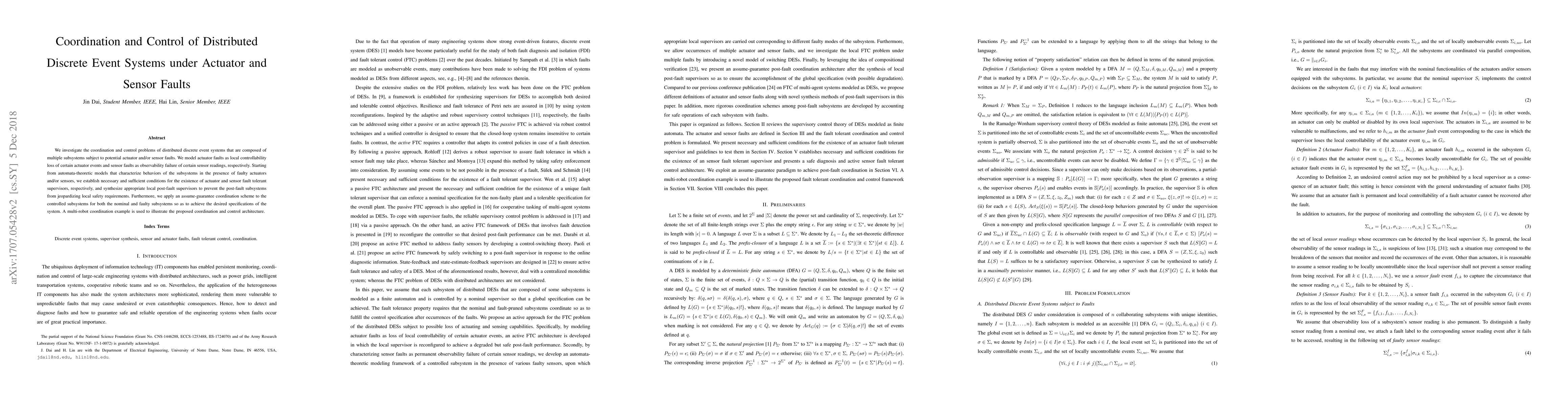 This paper explores coordination and control strategies for distributed discrete event systems with actuator and sensor faults. It establishes conditions for fault-tolerant supervisors and synthesizes local post-fault supervisors to maintain safety, applying an assume-guarantee coordination scheme to achieve system specifications, as demonstrated through a multi-robot coordination example.