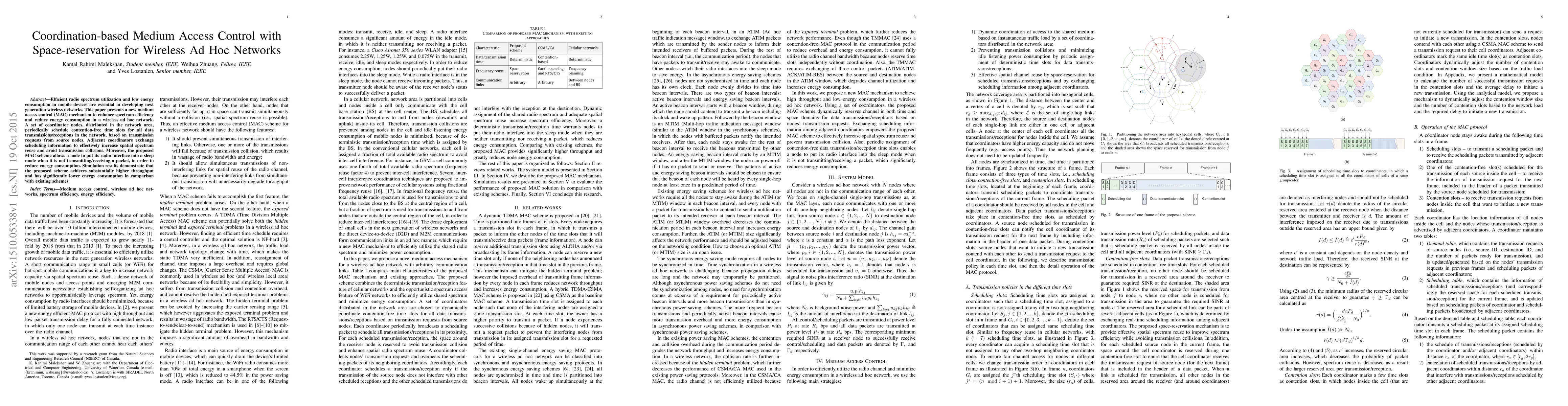 This paper introduces a new medium access control mechanism for wireless ad hoc networks that enhances spectrum efficiency and reduces energy consumption by using coordinator nodes to schedule contention-free time slots and allowing nodes to sleep when not in use. Simulation results show improved throughput and lower energy usage compared to existing methods.