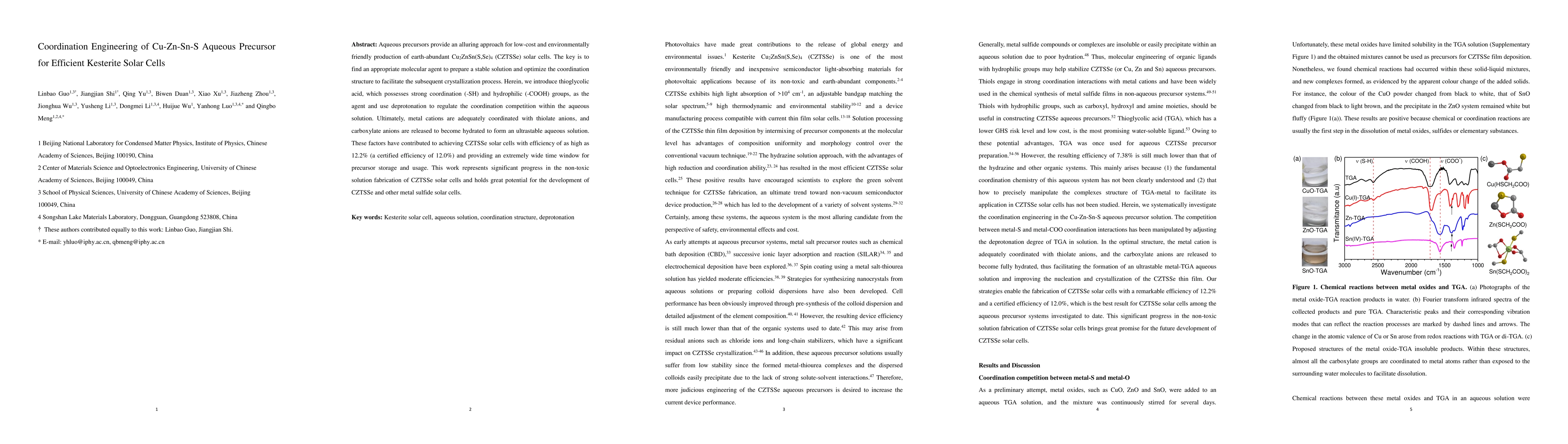Researchers developed an efficient method for producing CZTSSe solar cells using thioglycolic acid as a coordination agent, achieving record efficiency of 12.2% in the process.