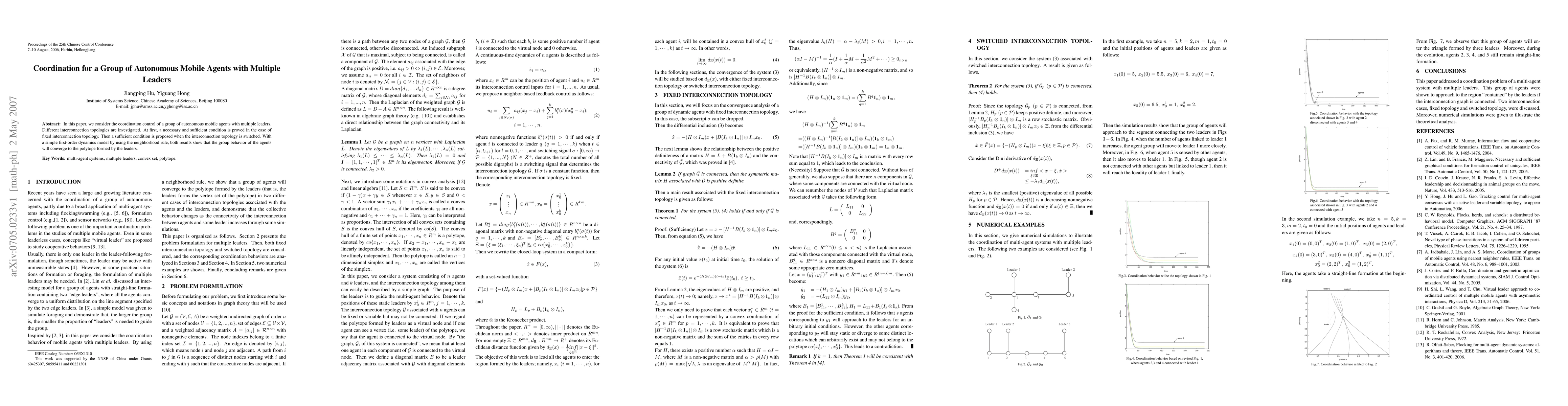 In this paper, we consider the coordination control of a group of autonomous mobile agents with multiple leaders. Different interconnection topologies are investigated. At first, a necessary and sufficient condition is proved in the case of fixed interconnection topology. Then a sufficient condition is proposed when the interconnection topology is switched. With a simple first-order dynamics model by using the neighborhood rule, both results show that the group behavior of the agents will converge to the polytope formed by the leaders.