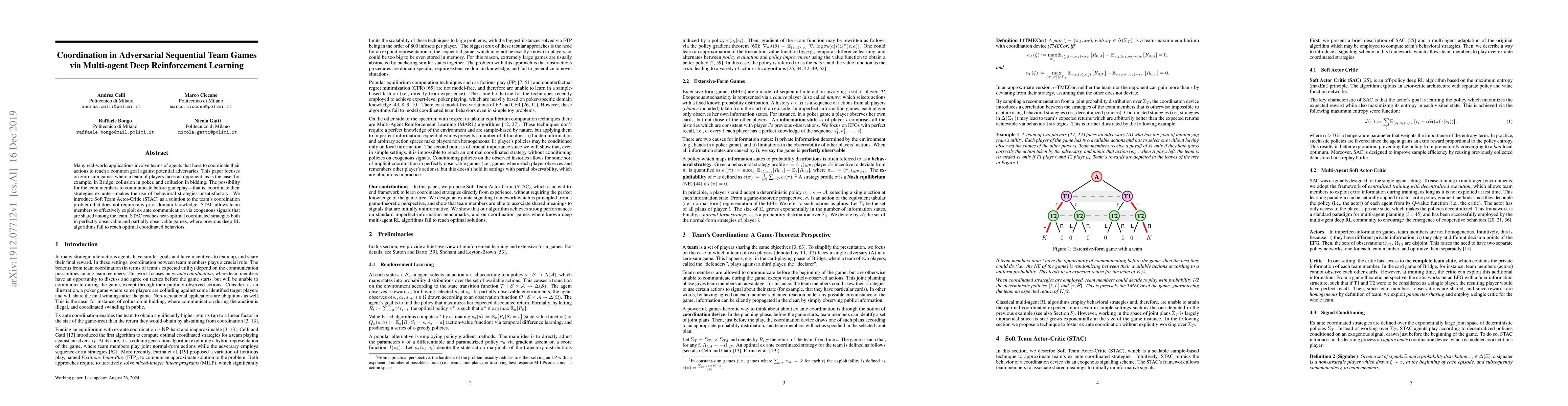This paper introduces Soft Team Actor-Critic (STAC) to coordinate team members in adversarial sequential games without prior domain knowledge. STAC leverages shared exogenous signals to achieve near-optimal coordinated strategies in both fully and partially observable zero-sum games, where traditional deep RL algorithms fall short.