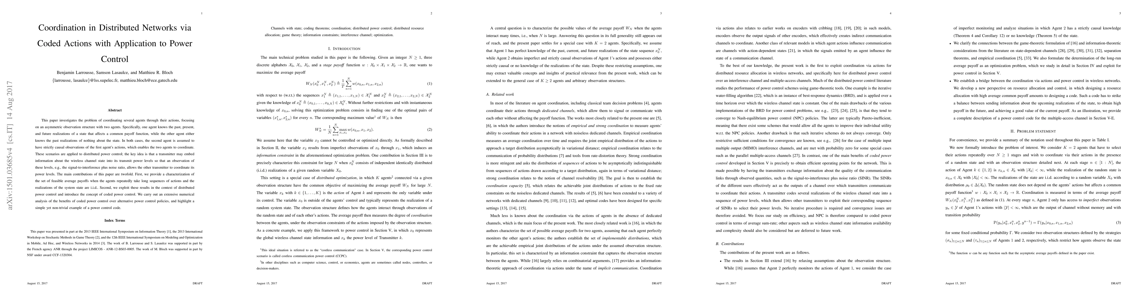 Researchers developed a method to coordinate multiple agents in distributed networks using coded actions, with applications in power control. The approach enables efficient coordination despite asymmetric observation structures, leading to improved performance over traditional power control policies.