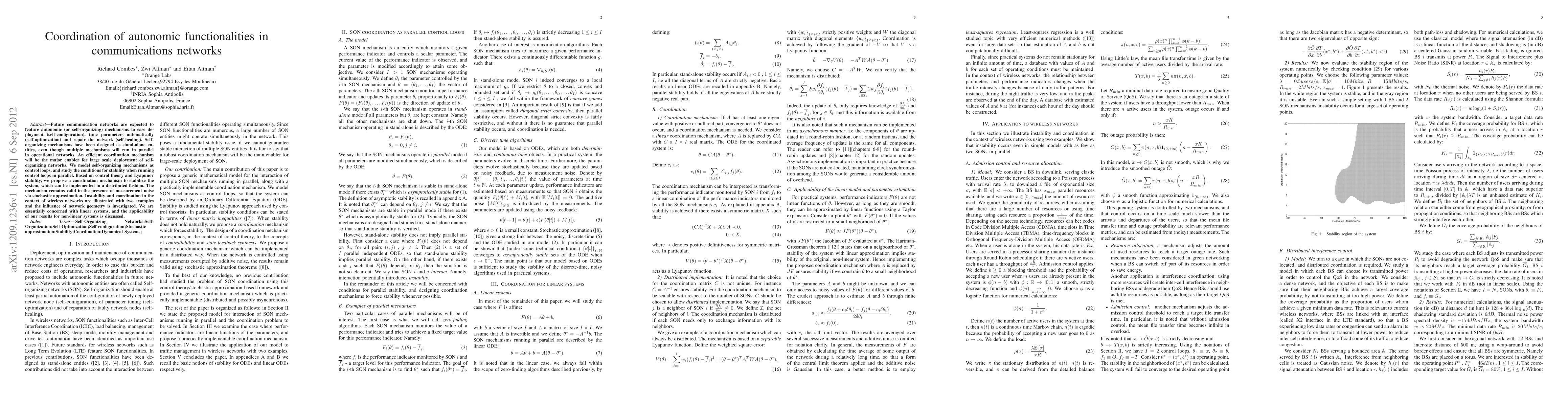 Future communication networks are expected to feature autonomic (or self-organizing) mechanisms to ease deployment (self-configuration), tune parameters automatically (self-optimization) and repair the network (self-healing). Self-organizing mechanisms have been designed as stand-alone entities, even though multiple mechanisms will run in parallel in operational networks. An efficient coordination mechanism will be the major enabler for large scale deployment of self-organizing networks. We model self-organizing mechanisms as control loops, and study the conditions for stability when running control loops in parallel. Based on control theory and Lyapunov stability, we propose a coordination mechanism to stabilize the system, which can be implemented in a distributed fashion. The mechanism remains valid in the presence of measurement noise via stochastic approximation. Instability and coordination in the context of wireless networks are illustrated with two examples and the influence of network geometry is investigated. We are essentially concerned with linear systems, and the applicability of our results for non-linear systems is discussed.